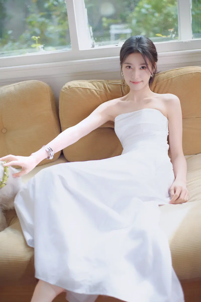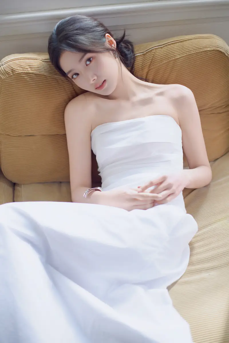 卢昱晓长发低挽优雅松弛 抹胸长裙尽显温柔仙气
