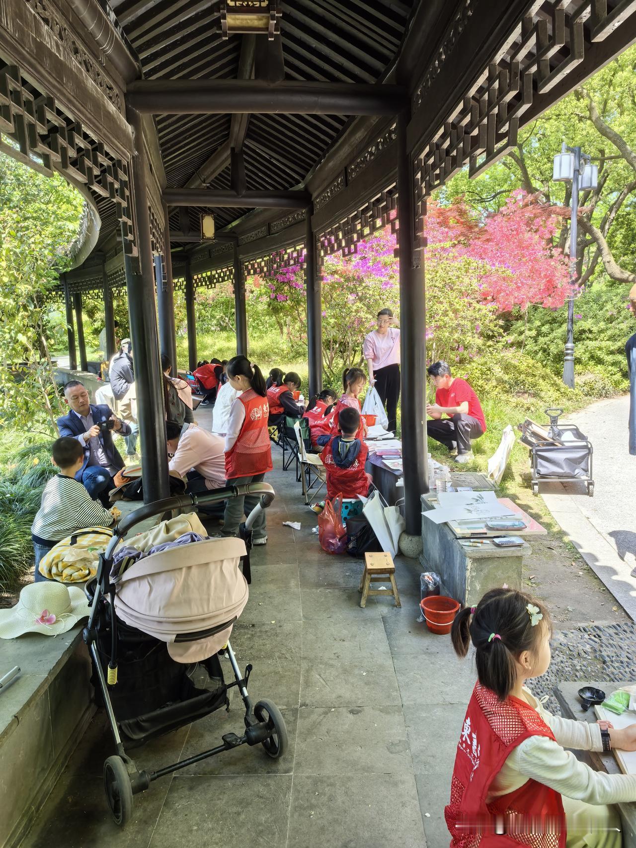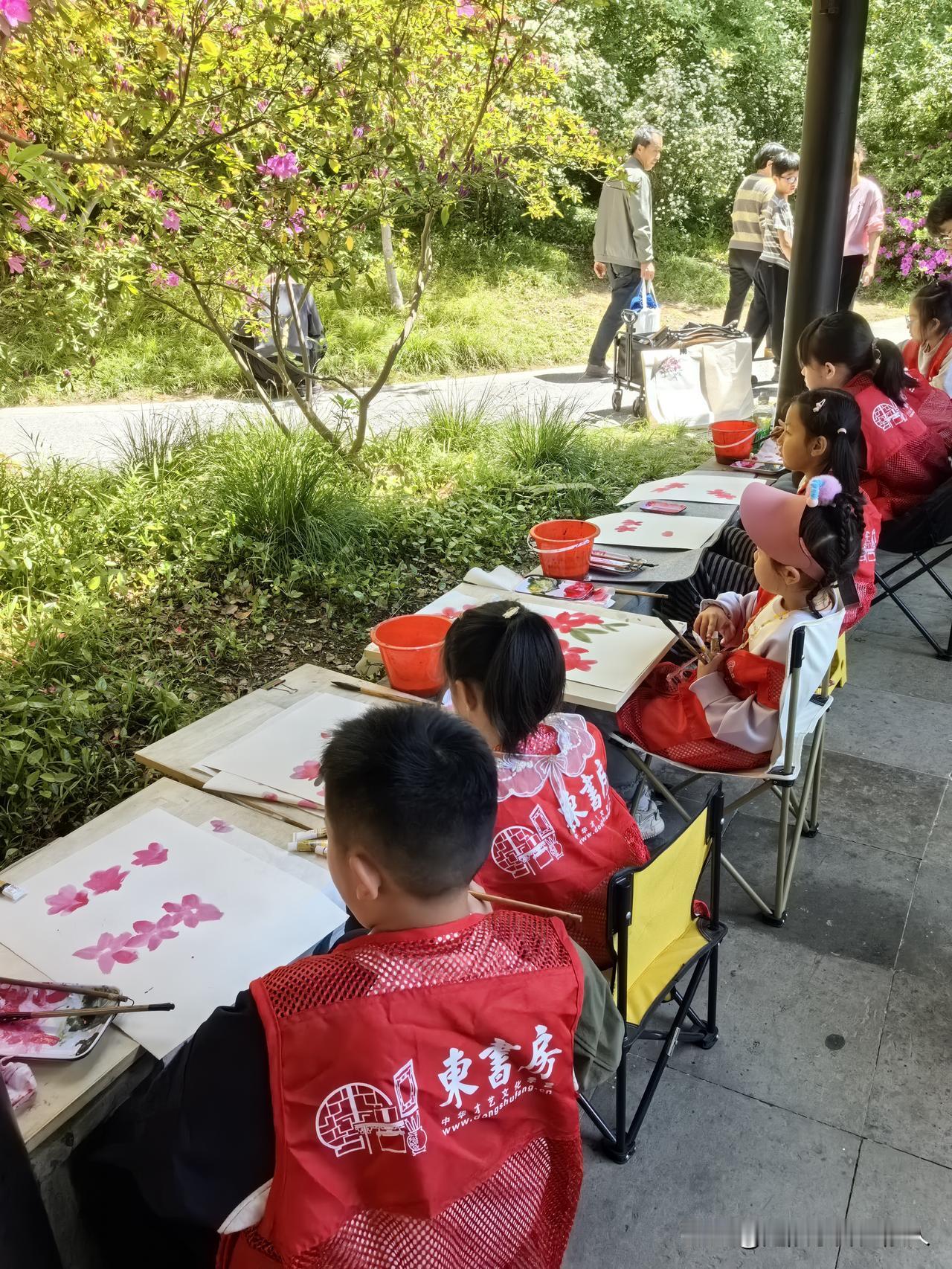 画杜鹃花的小朋友,在红梅公园里面,看到了一群画花的小朋友。