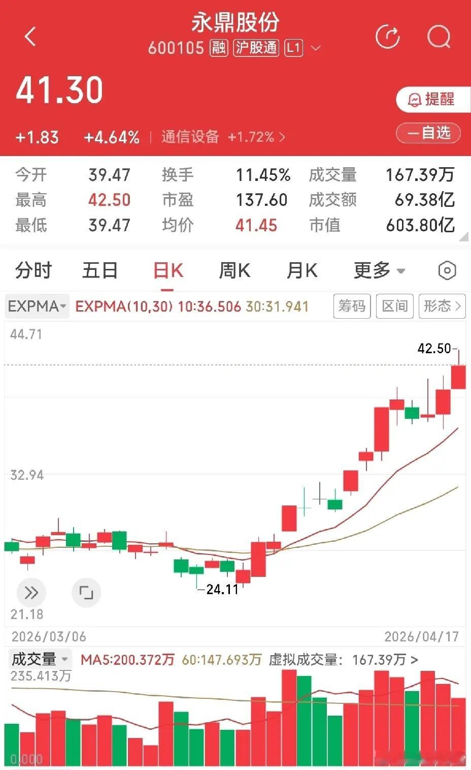 回想之前做过的永鼎股份,当初八元多的成本,如今已是四十元,行情涨幅惊人。