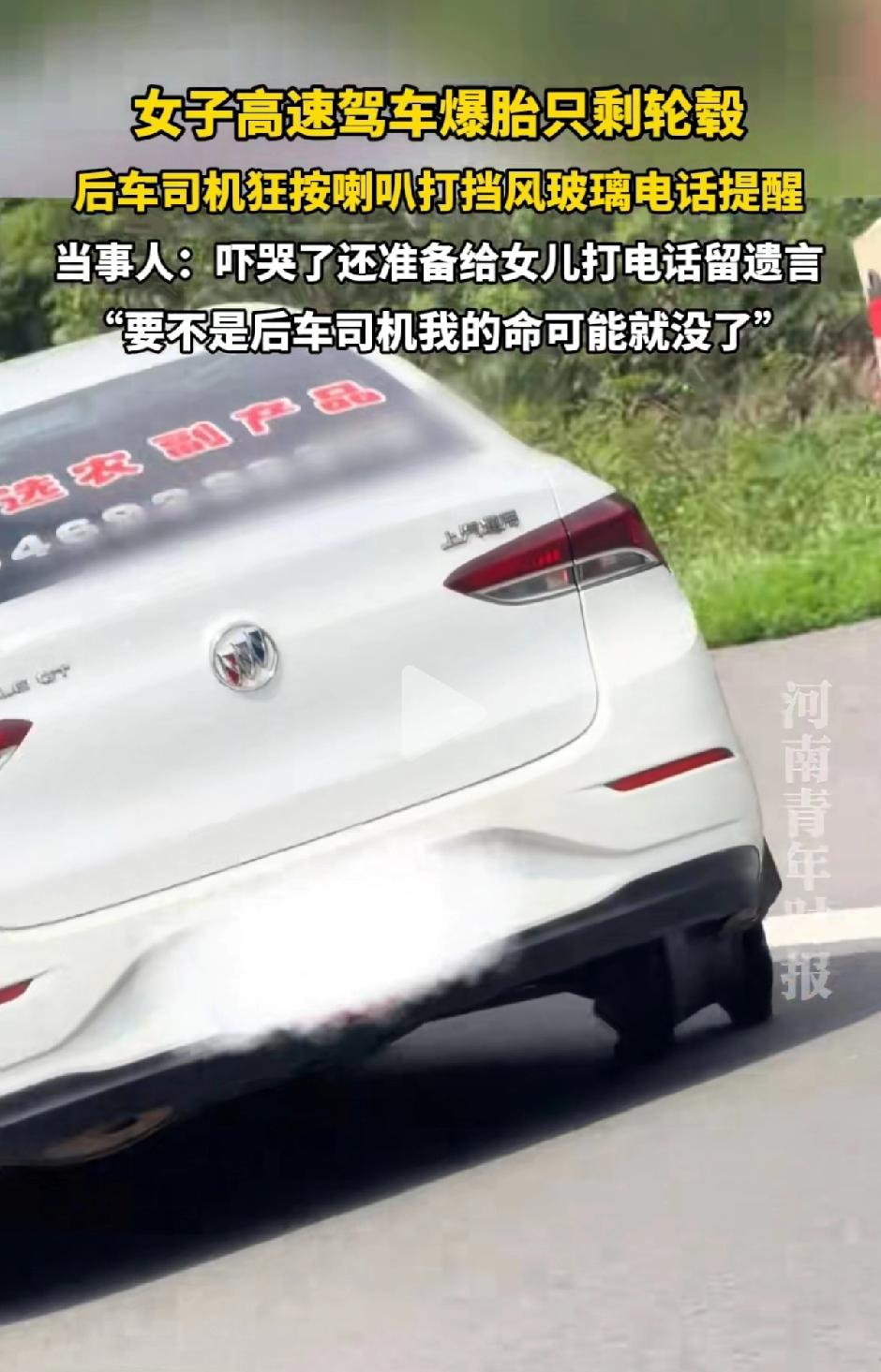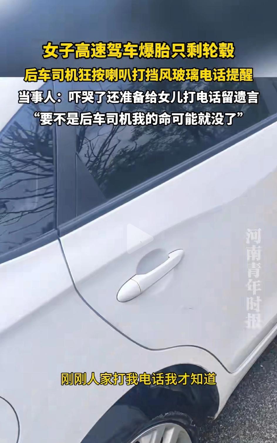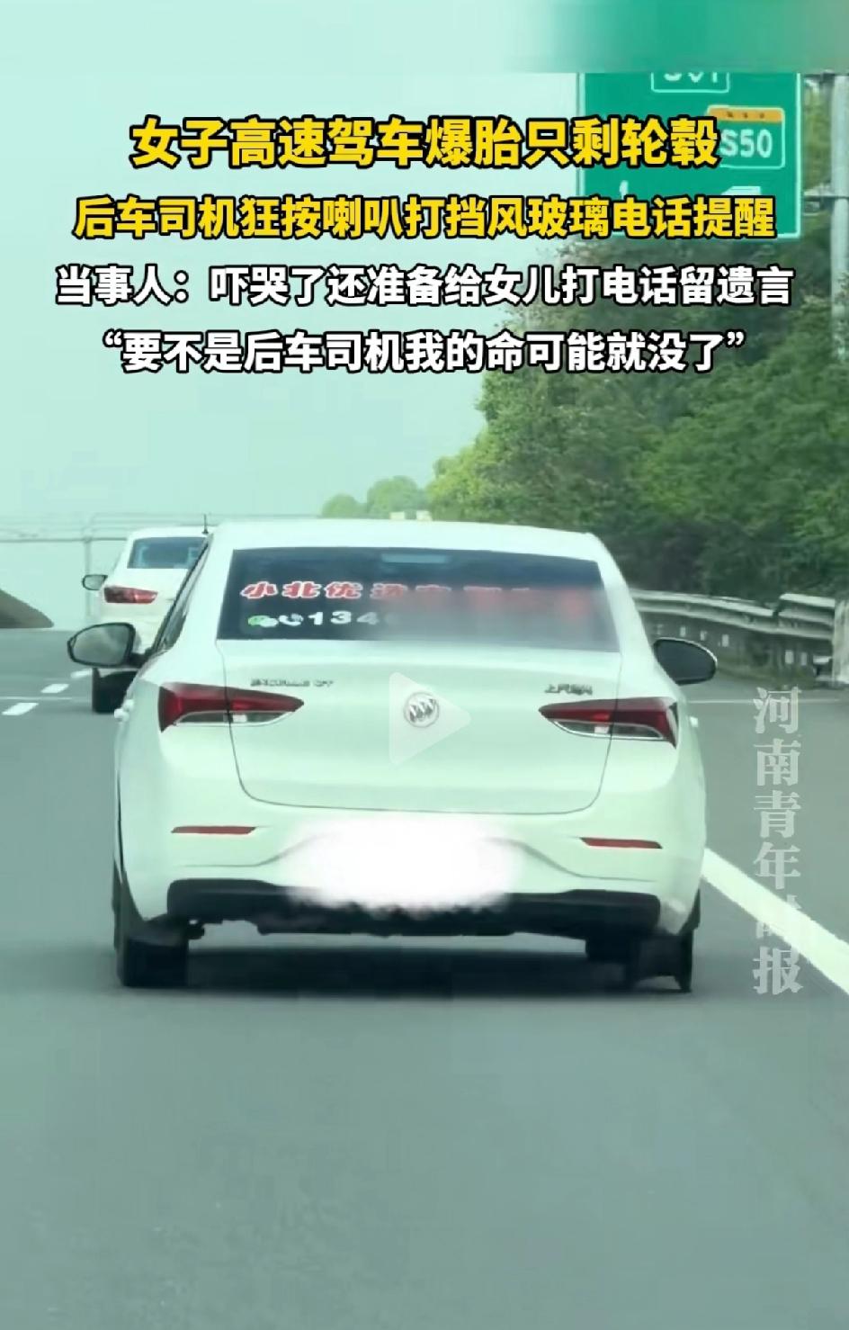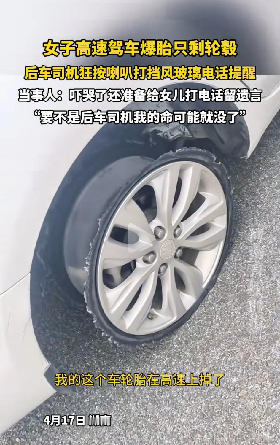 有惊无险,一女子在高速上开车,开着开着轮胎掉了,只剩下轮毂。她吓哭了,还准备给女儿打电话留遗言。她说要不是后车司机,我的命可能就没了。这个女的浑然不知,还在继续开,后车疯狂按喇叭给她打电话提醒她。这个女的知道后当时吓死了,第一时间想到的时候给女儿打电话留遗言。