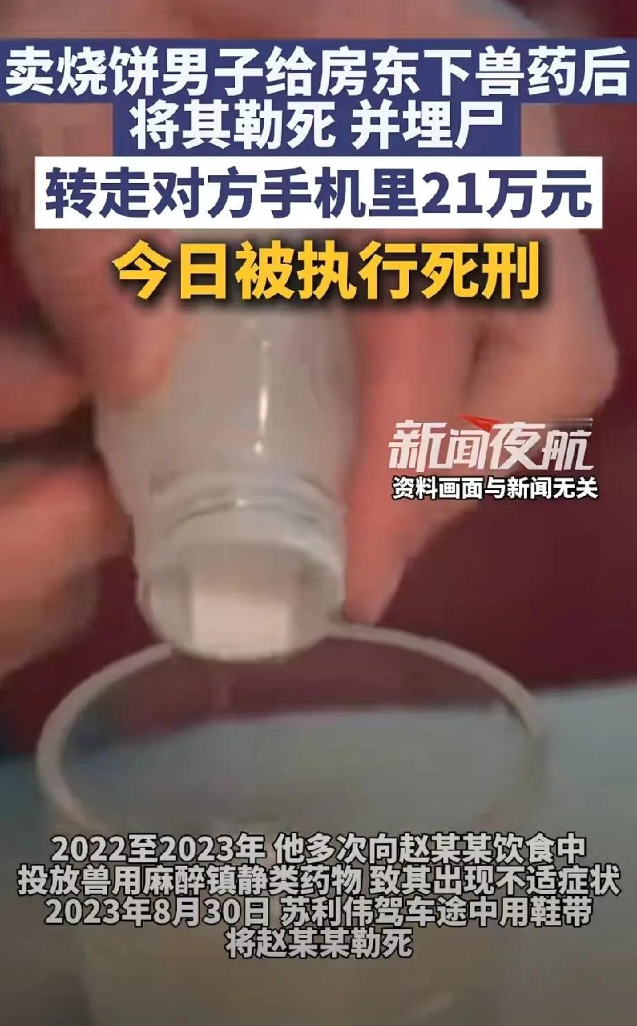 信息来源:卖烧饼男子下兽药后勒死房东,转走对方手机里21万元,今日被执行死刑——极目新闻