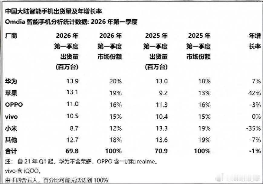 而一年前的2025年一季度,小米曾以1330万部的出货量时隔十年重返国内第一,雷军连发多条微博庆祝。一年之后,随着鸿蒙生态不断成熟,苹果凭借iPhone 17系列的产品力提升和价格策略优化,在中国市场出货量同比增长超过42%。就在这个时候,小米被挤出了前四。