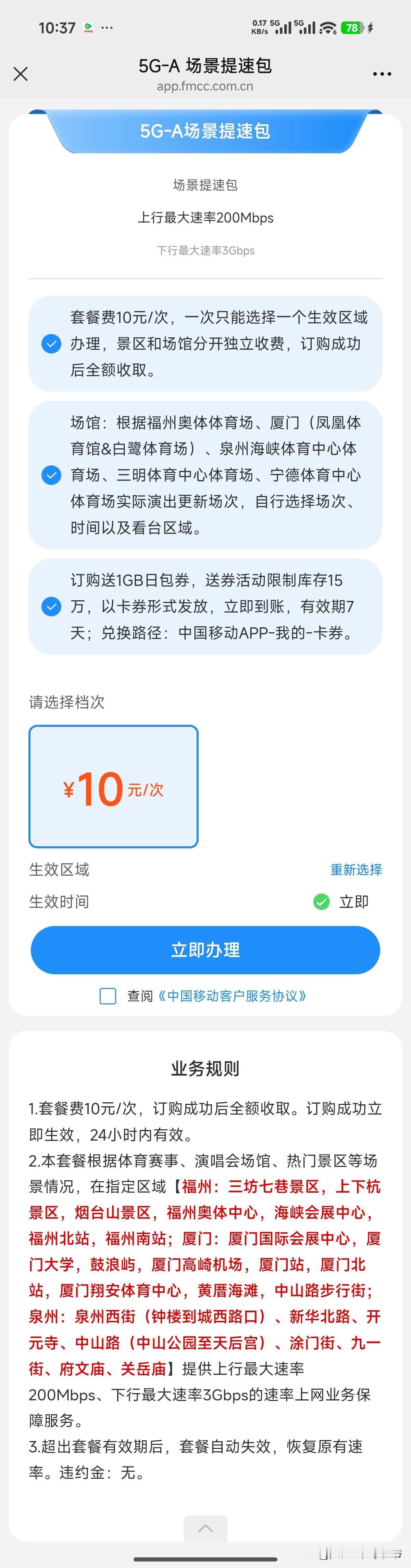 福建移动和福建电信在闽超赛事期间都上线了5GA网络加速单日场景包。作为某运营商的钻石卡用户,我其实早就叠加了5GA最高速率臻享服务包,官方标注下行能到3Gbps、上行200Mbps,但实际体验下来,网速跟没开之前几乎没差,完全感受不到所谓“加速”带来的变化。