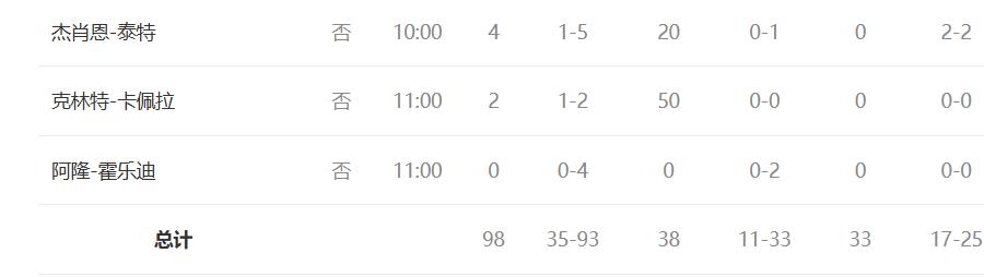 更惨的还在替补席,阿隆霍乐迪上场11分钟,结果4投0中,三分球2投0中没有得分,数据榜上写着尴尬的0分0板0助攻和1次失误,在场上也就这次失误还比较有存在感。