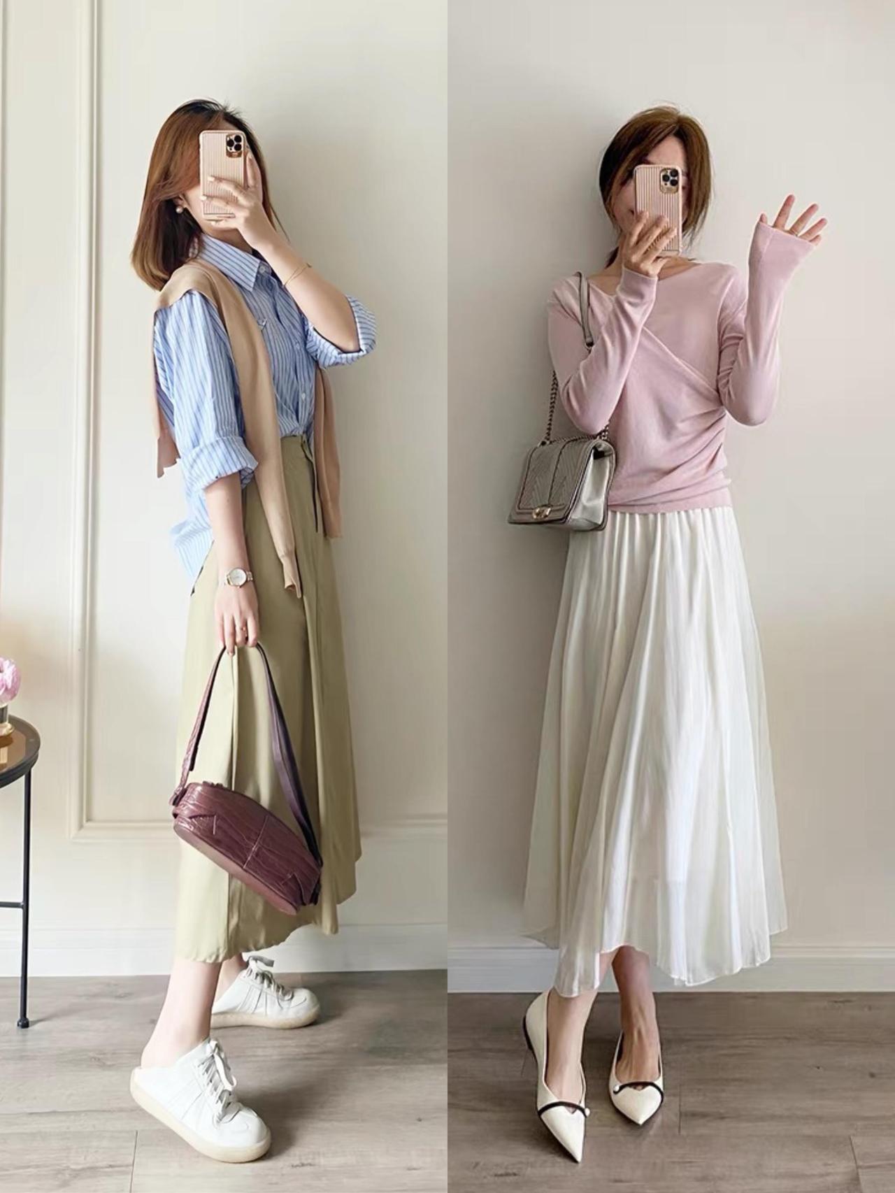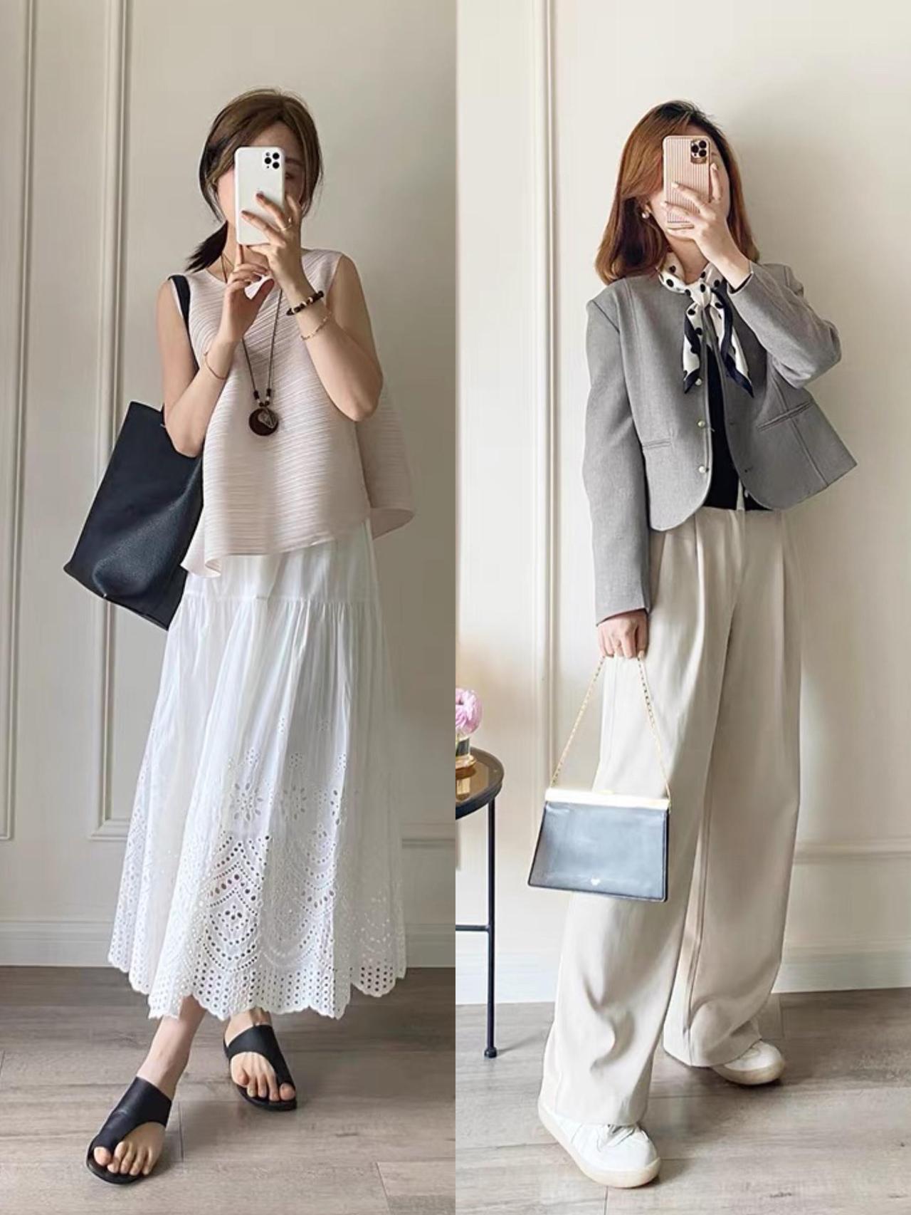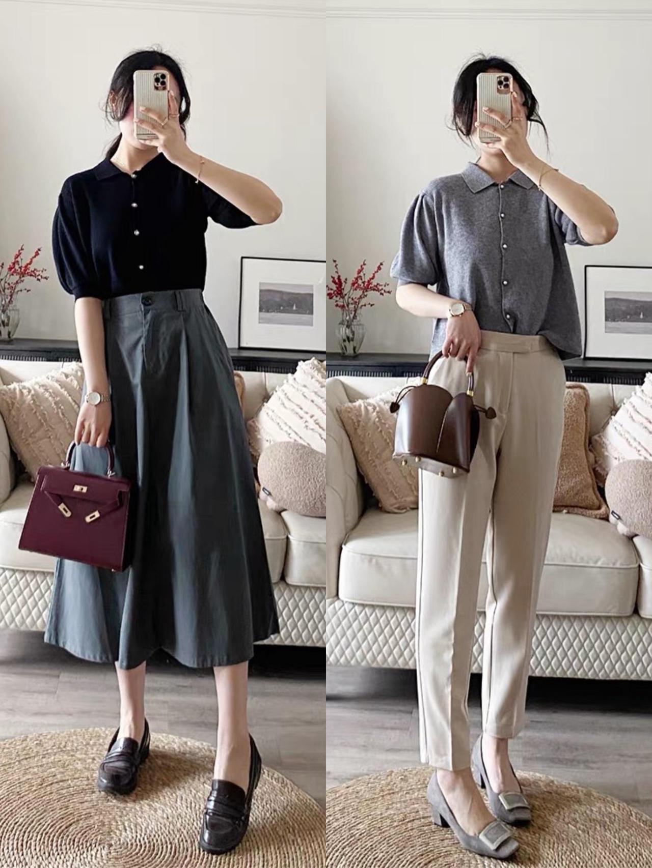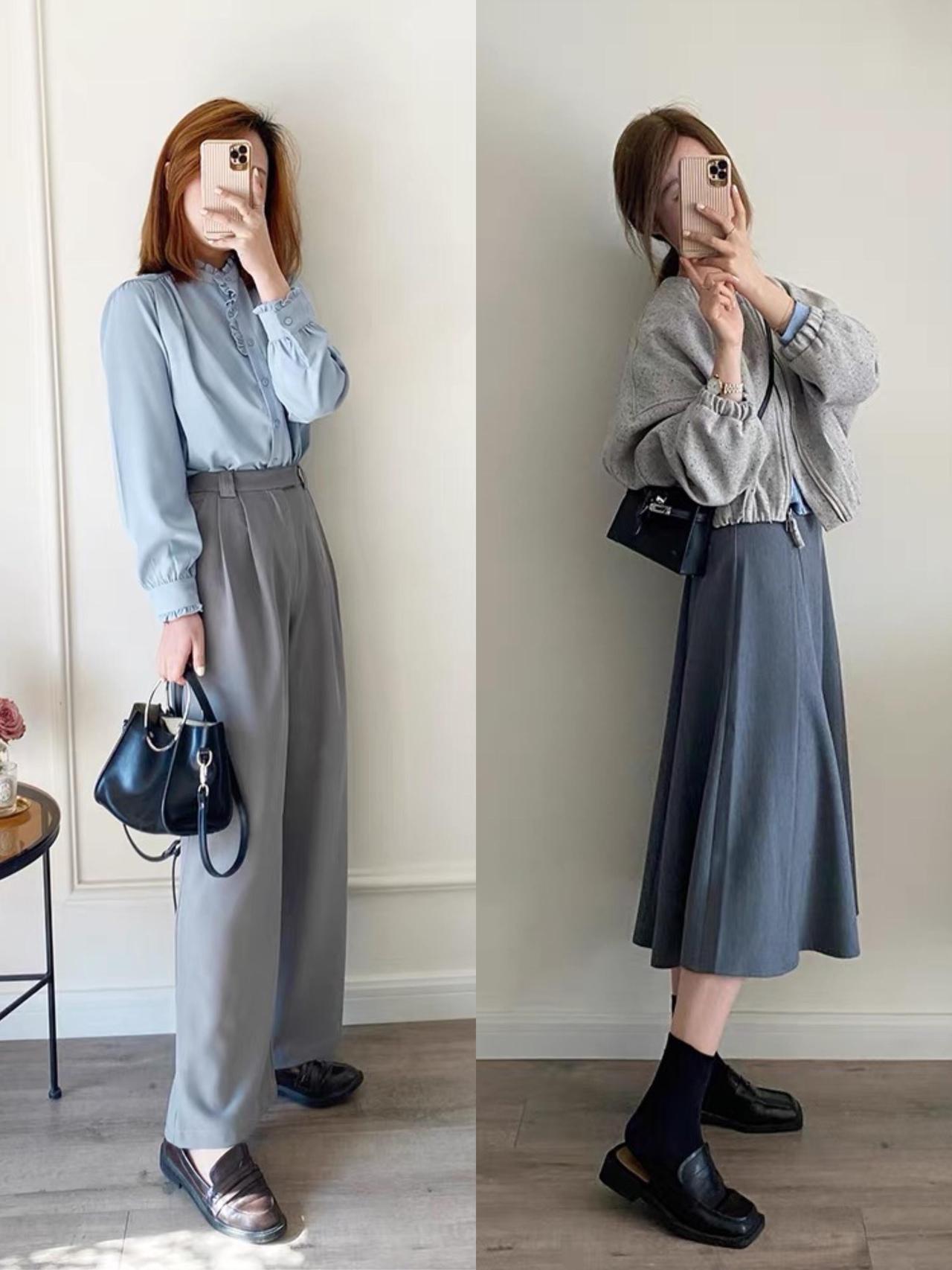 低饱和色系搭配简约利落的版型,把通勤氛围感拉满。针织开衫、衬衫、西装和半裙、阔腿裤的组合,温柔又显瘦,不张扬却很有质感。搭配精致的小包包和低跟鞋,细节里透着优雅,日常通勤或轻商务场合都能hold住,轻松穿出得体又松弛的轻熟风。