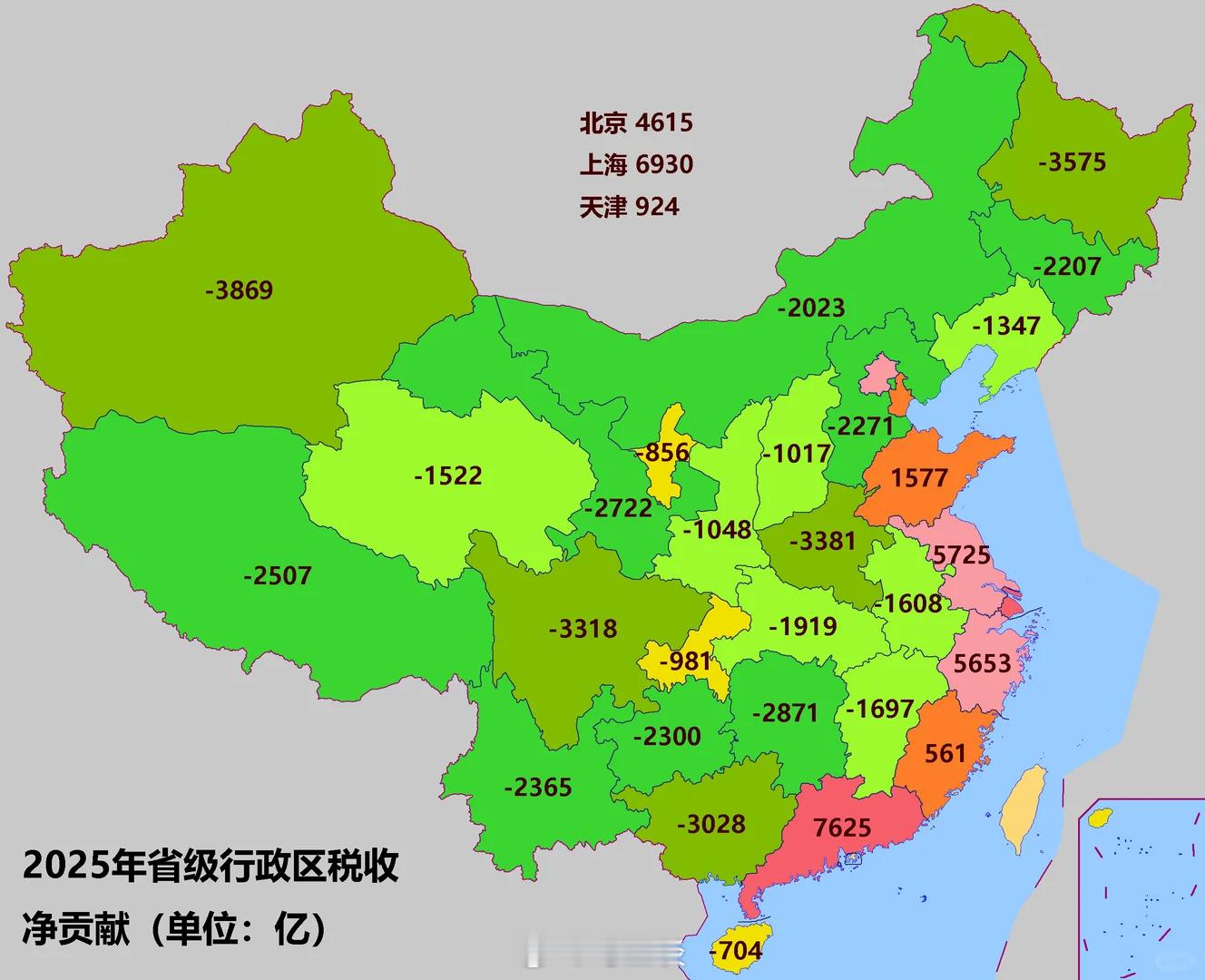 全国税收地图。真正“净贡献”的省市只有8个:广东、上海、江苏、浙江、北京、山东、天津、福建。