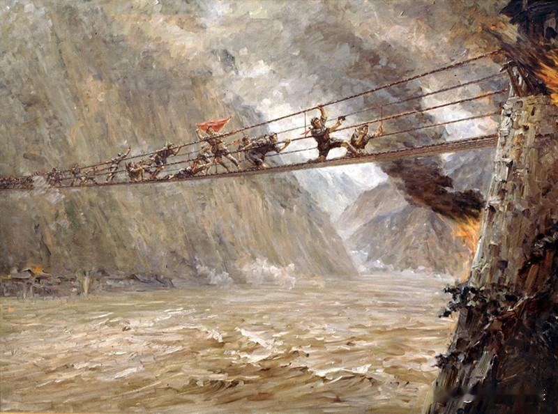 第二个细节,是铁索上的险境,并非只有光溜溜的铁链。很多人以为,泸定桥的木板是被敌人全部拆光了,实则不然,驻守泸定桥的川军,拆走了桥面上绝大部分木板,只在东桥头的位置,留了短短一段。更凶险的是,当红军战士冲到桥头时,敌人直接在东桥头浇上煤油,燃起了大火,试图用火海挡住冲锋的脚步。泸定桥全长103.67米,宽3米,由13根碗口粗的铁索搭建而成,桥下是水流湍急、礁石密布的大渡河,一旦失足,绝无生还的可能 。22名勇士组成的突击队,背着马刀,带着手榴弹和冲锋枪,踩着摇晃的铁索,迎着对岸密集的炮火冲锋。身后的战士,一边冲锋,一边铺着木板,为后续部队打通前进的路。这场战斗,从清晨打到黄昏,红军最终拿下了泸定桥,彻底打破了蒋介石的围堵计划。