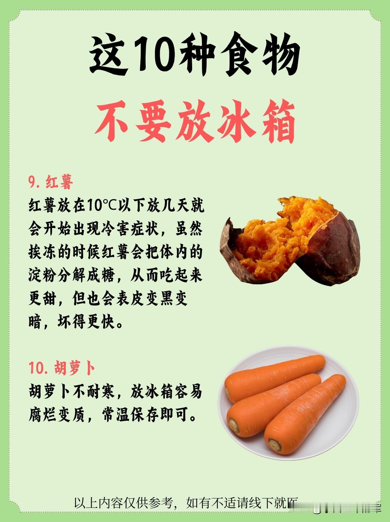 10. 胡萝卜:不耐寒,冰箱潮湿环境容易腐烂变质,常温保存就能保持脆嫩口感。