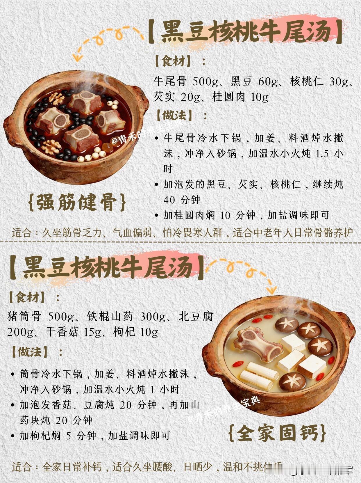 1. 黑豆核桃牛尾汤(强筋健骨)