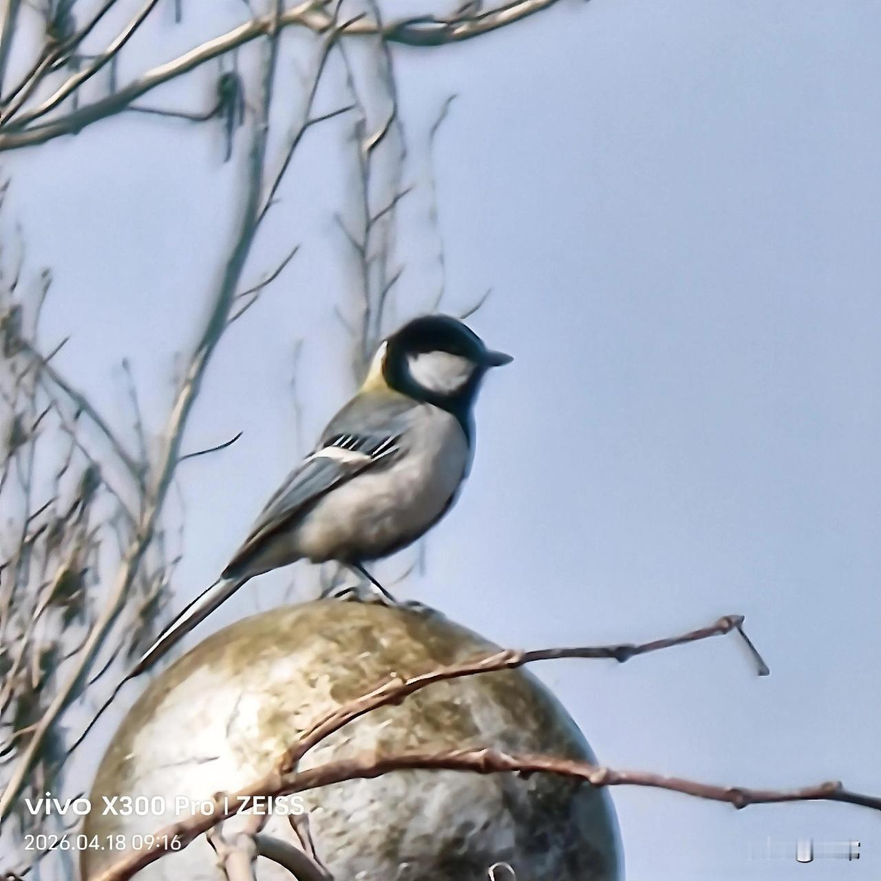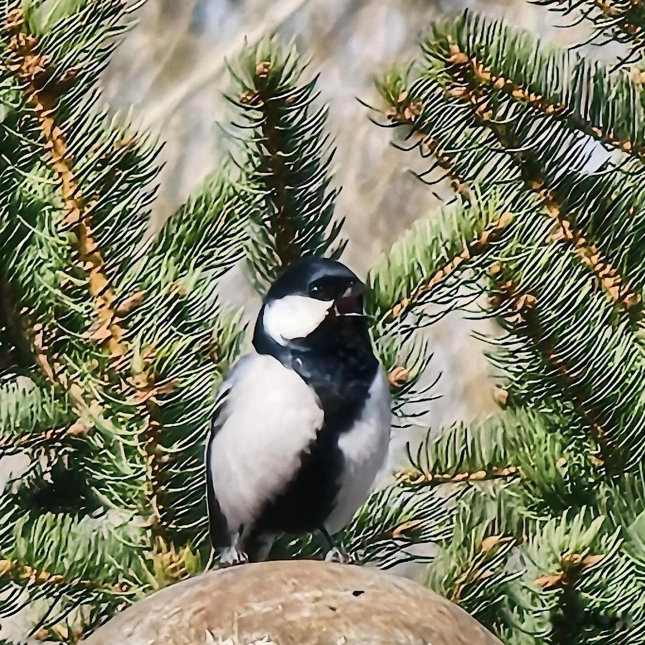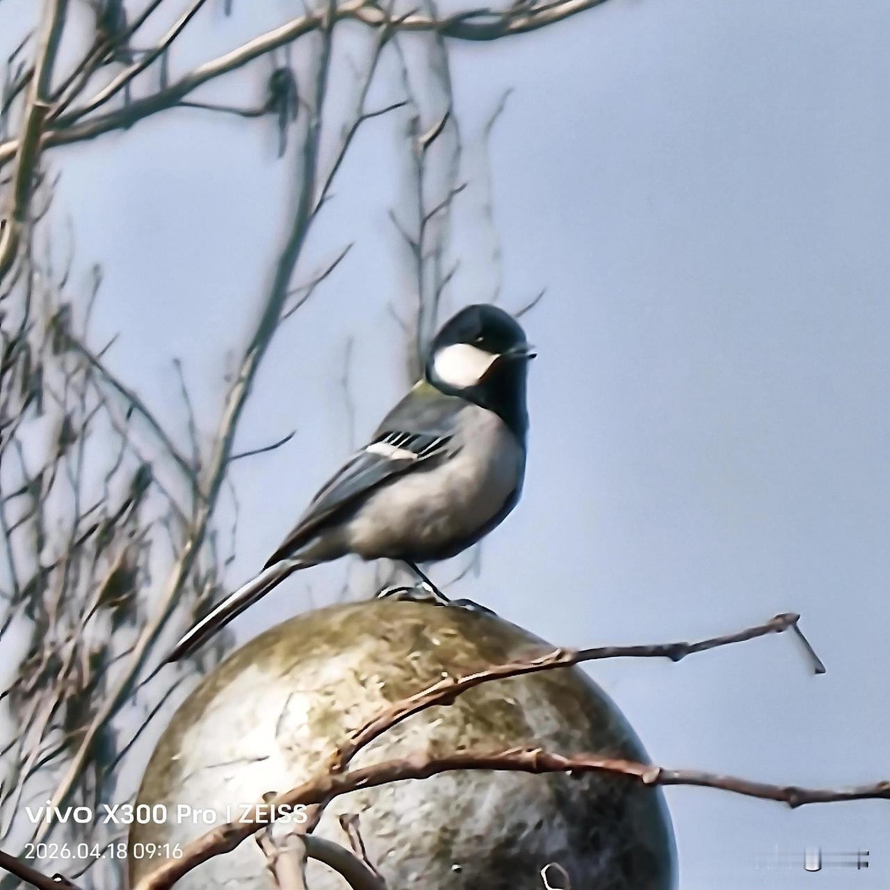 大山雀头顶的黑羽,像一顶整齐的小礼帽,脸颊的白斑干净的像落了片雪,翅膀上那道细细的白纹,是它灰羽衣裳上最别致的装饰。