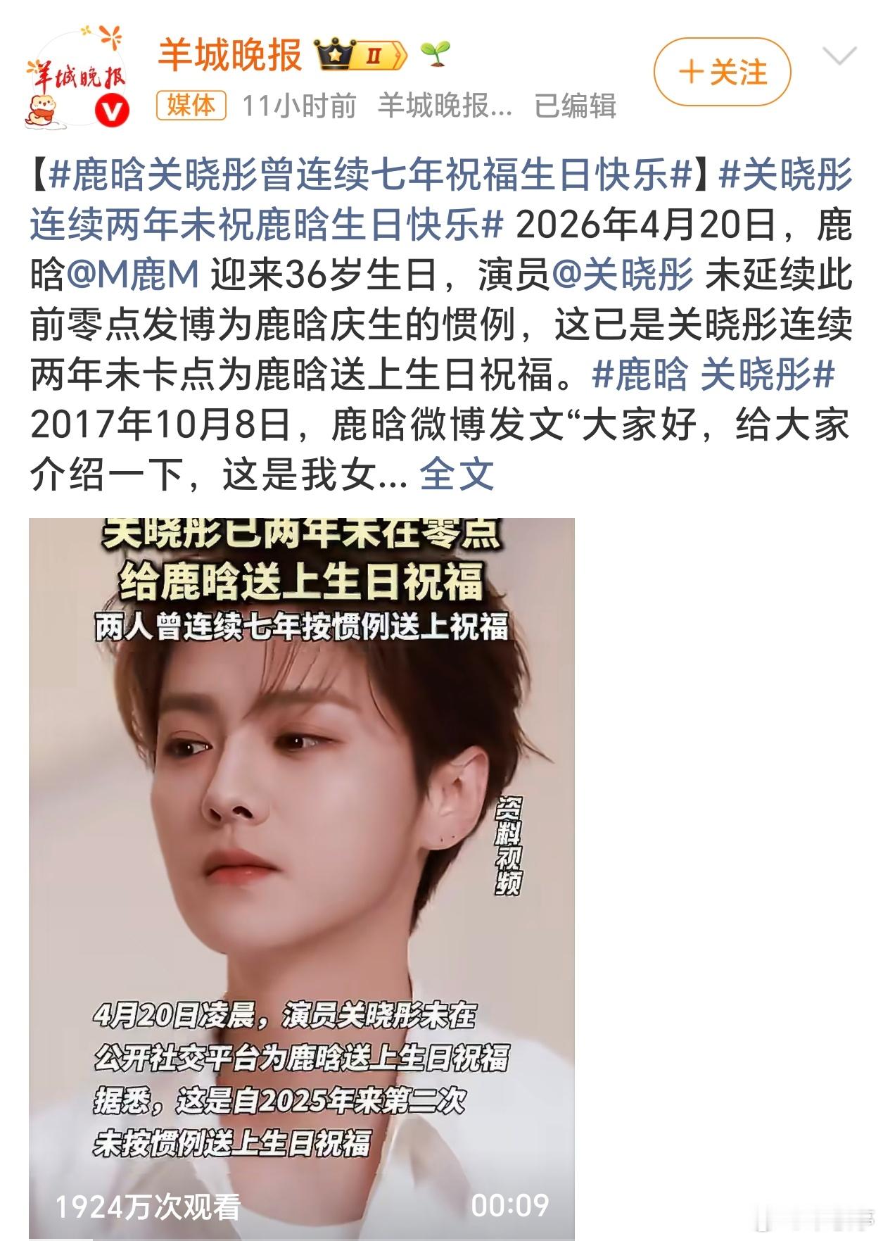 鹿晗36岁生日群星送祝福,关晓彤连续缺席引婚变猜测4月20日鹿晗