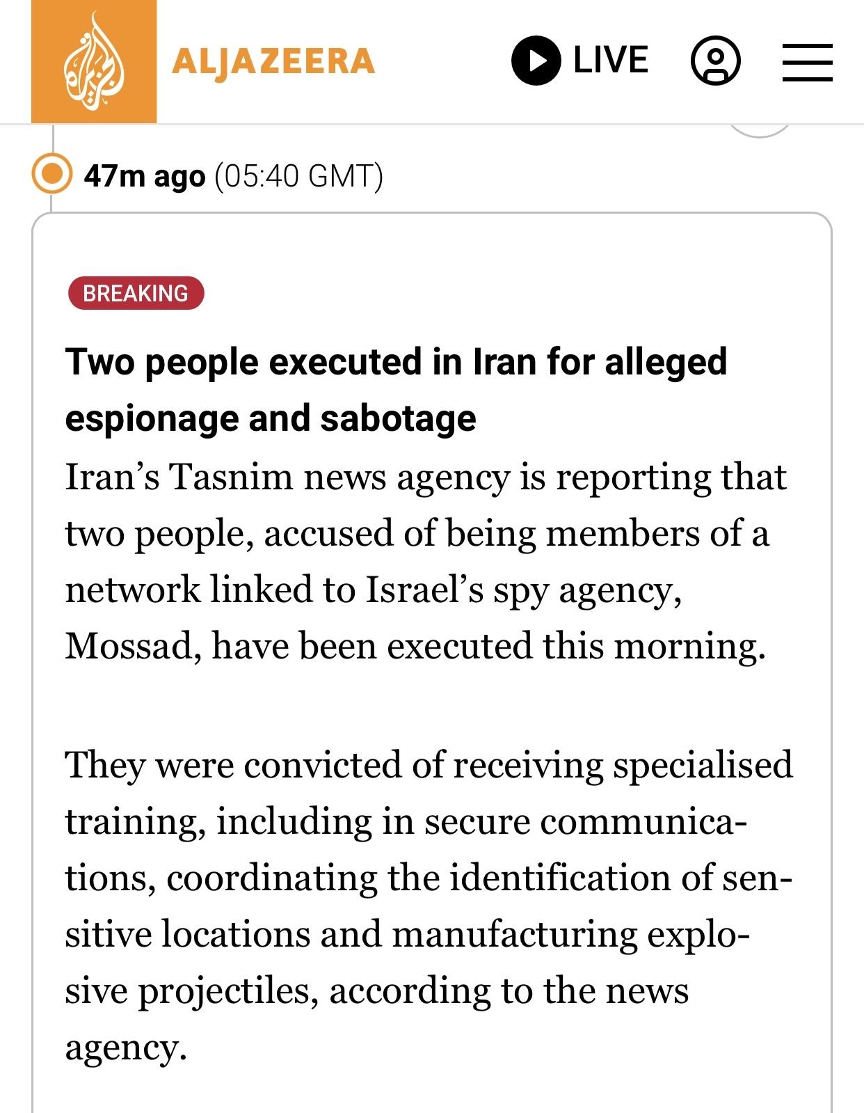 另据报道:伊朗塔斯尼姆通讯社报道称,两名被指控与以色列间谍机构摩萨德有关联的成员,已于今日上午被处决。据该通讯社报道,他们被指曾接受过包括安全通信、协助对敏感地点识别,以及制造爆炸物在内的专业训练。