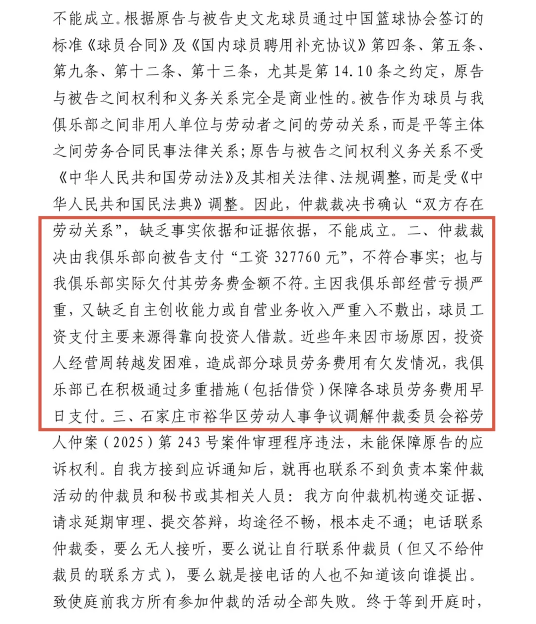 虎扑04月20日讯据媒体人赵环宇发文:日前,有5名曾经在NBL石家庄翔蓝篮球俱乐部(以下简称石家庄翔蓝)效力的球员向我反映,他们遭遇石家庄翔蓝欠薪11万至26万不等,其中有4名运动员被欠薪接近2年。期间,经历了劳动仲裁、俱乐部补发部分工资之后,石家庄翔蓝将这4名球员起诉,希望法院判定不存在劳动关系、俱乐部不支付仲裁委裁决的工资数额……目前,这场旷日持久的劳资纠纷,似乎毫无结束的迹象。
