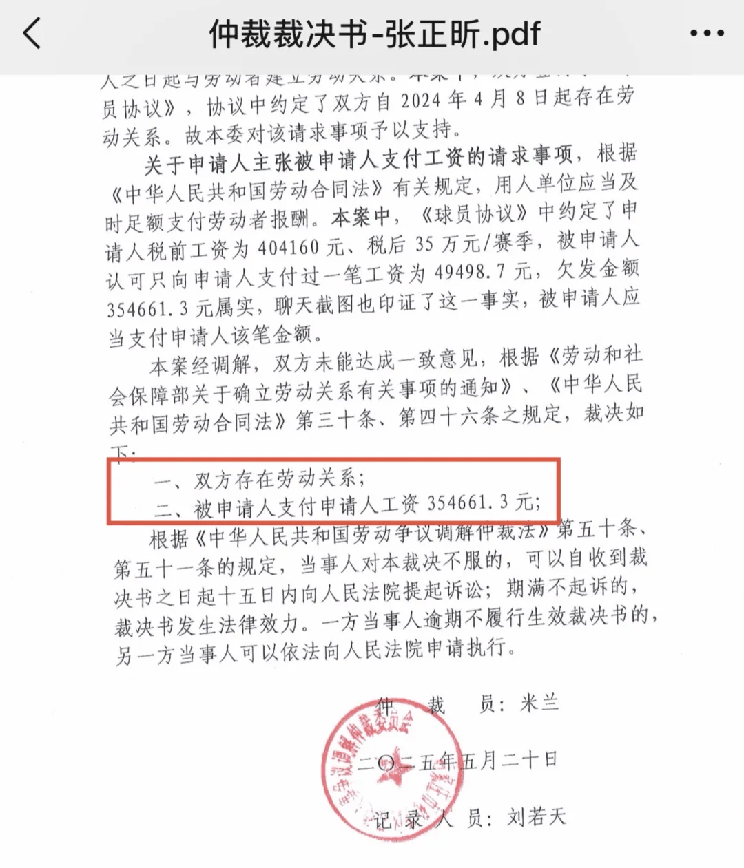 仲裁委于去年5月20日出具的4份《仲裁裁决书》显示,仲裁委支持了4位球员的诉求,即:双方存在劳动关系,石家庄翔蓝应支付4人工资。工资的数额分别是史文龙327760万元、宋帅517530.6元、张正昕354661.3元、王浩宇173332元。