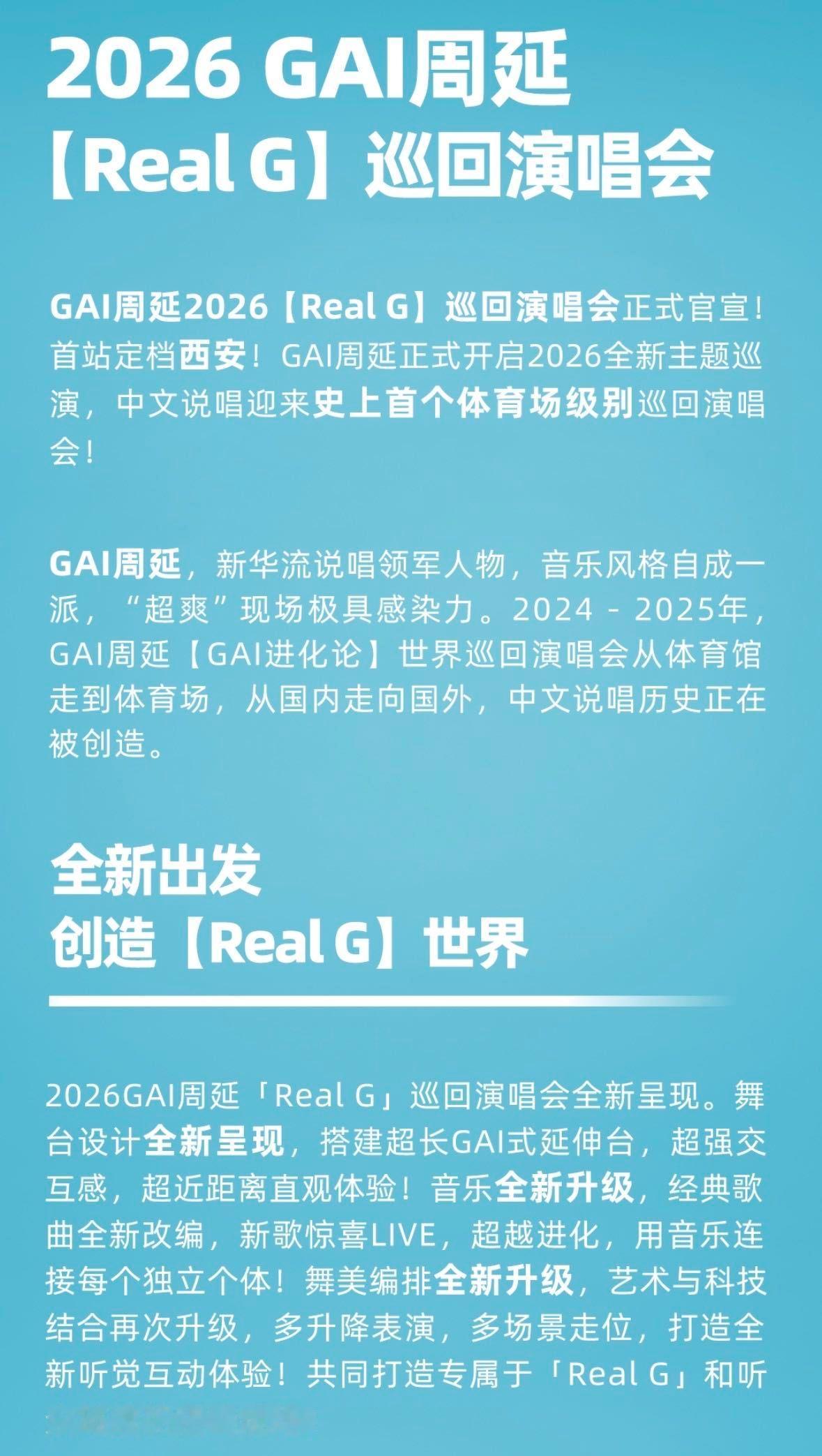 GAI中文说唱首个体育场巡演GAI中文说唱界体育场巡演第一人 GAI周延全新REAL G巡演正式官宣,妥妥的行业第一人,5月30日西安奥体中心开启首站,以顶级配置刷新说唱现场规格,全新舞美、改编金曲搭配新歌首秀,超长延伸台带来近距离互动,从场馆升级到体育场,用高能量现场打破边界,真的是期待值拉满了!