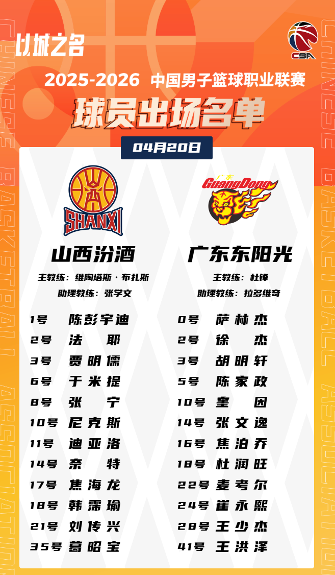 虎扑04月20日讯今日CBA常规赛,山西对阵广东的大名单已经出炉。