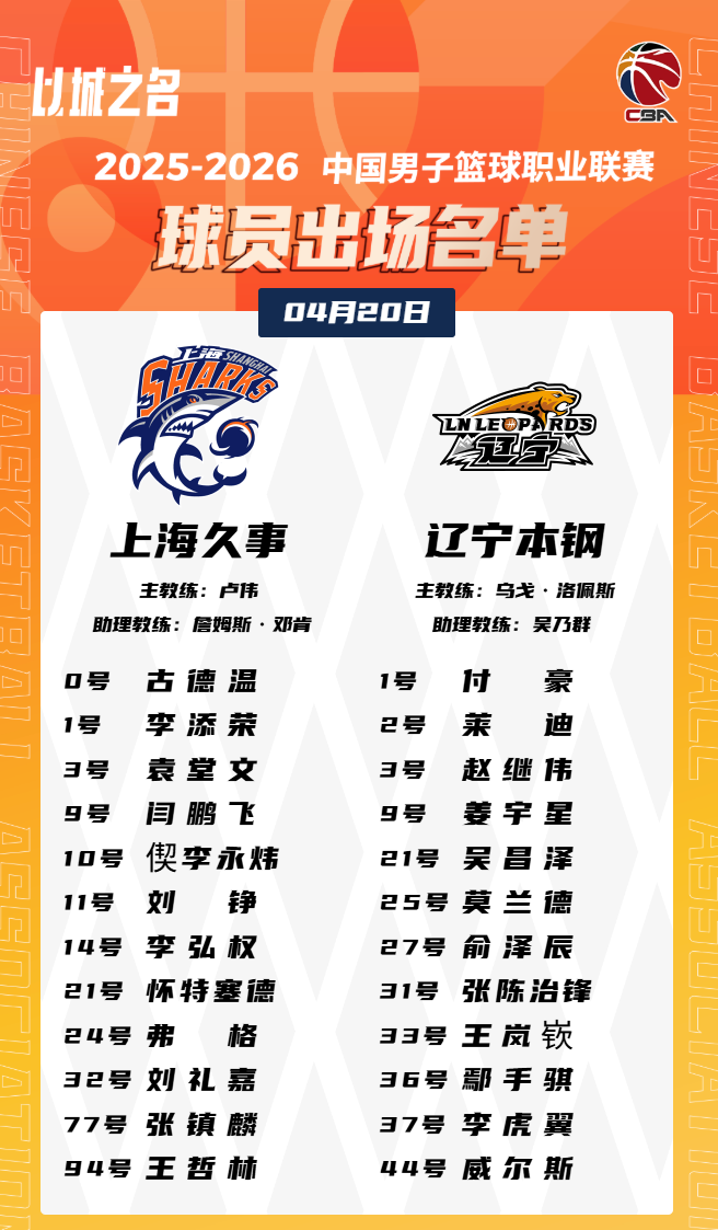 虎扑04月20日讯今晚CBA常规赛,上海对阵辽宁的大名单已经出炉。