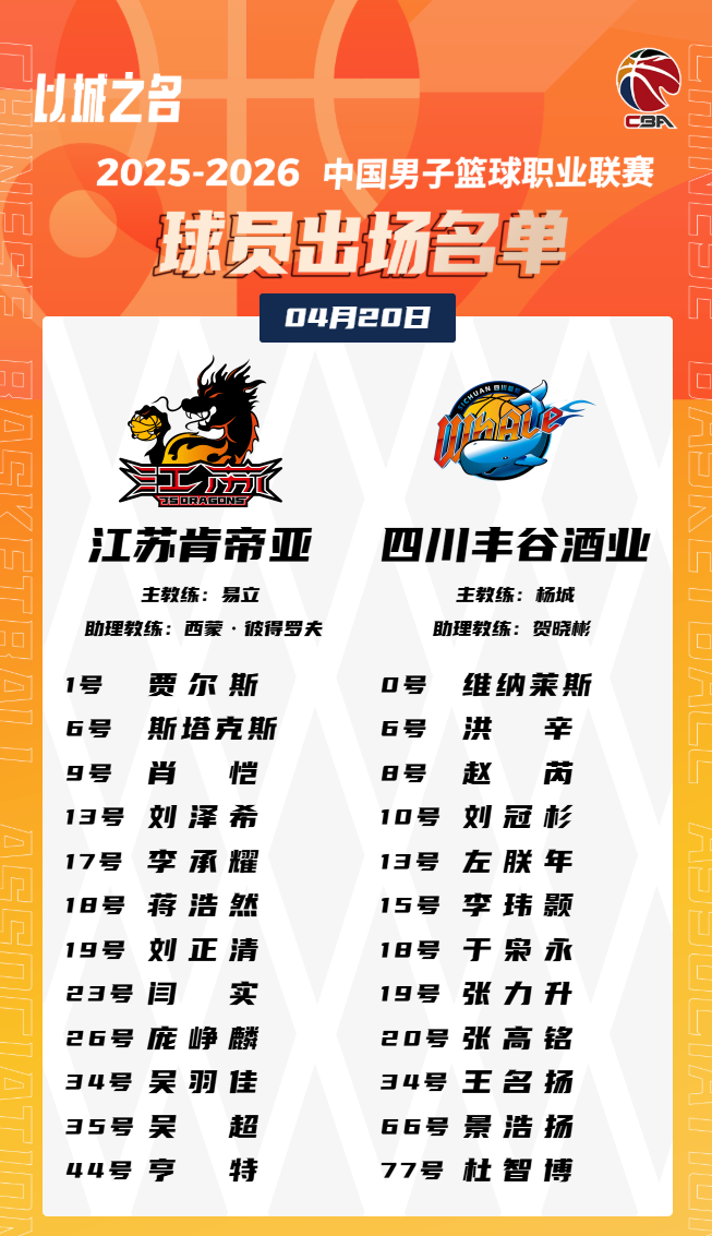 虎扑04月20日讯今晚CBA常规赛,四川对阵江苏大名单已经公布。
