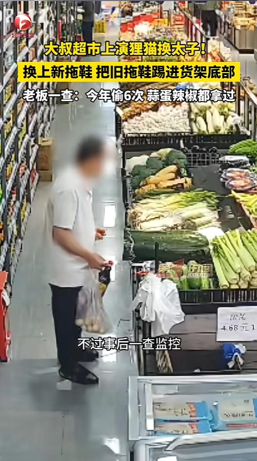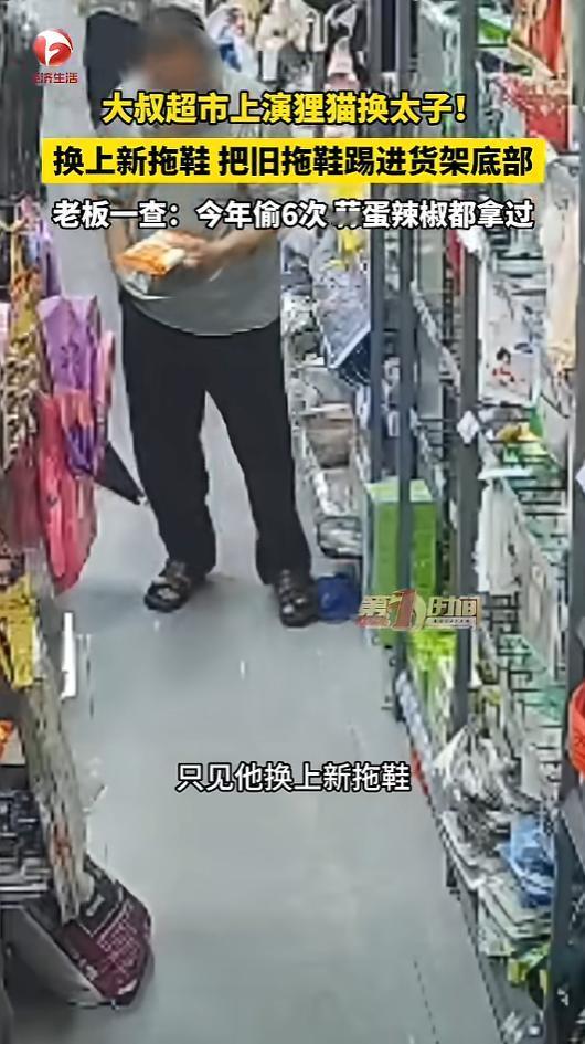 信息来源:《大叔超市上演狸猫换太子 !换上新拖鞋 把旧拖鞋踢进货架底部,老板一查:今年偷6次 蒜蛋辣椒都拿过。》AHTV第一时间