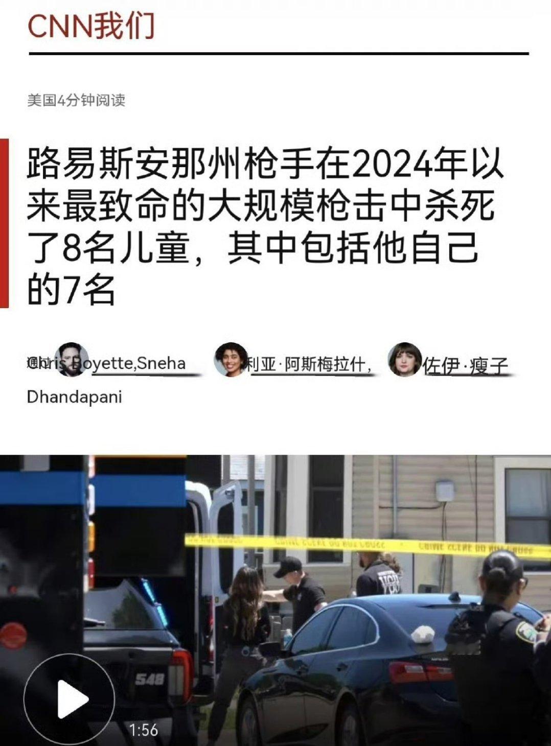 美国发生2024年以来最严重枪击案4月19日凌晨,美国路易斯安那州什里夫波特市发生一起家庭纠纷引发的枪击案,枪手沙马尔·埃尔金斯在三处住宅杀害8名儿童(其中7人为其亲生子女,年龄1-12岁),致两名女性重伤,一名13岁男孩跳楼逃生骨折。凶手曾服役于陆军国民警卫队,作案后劫车...