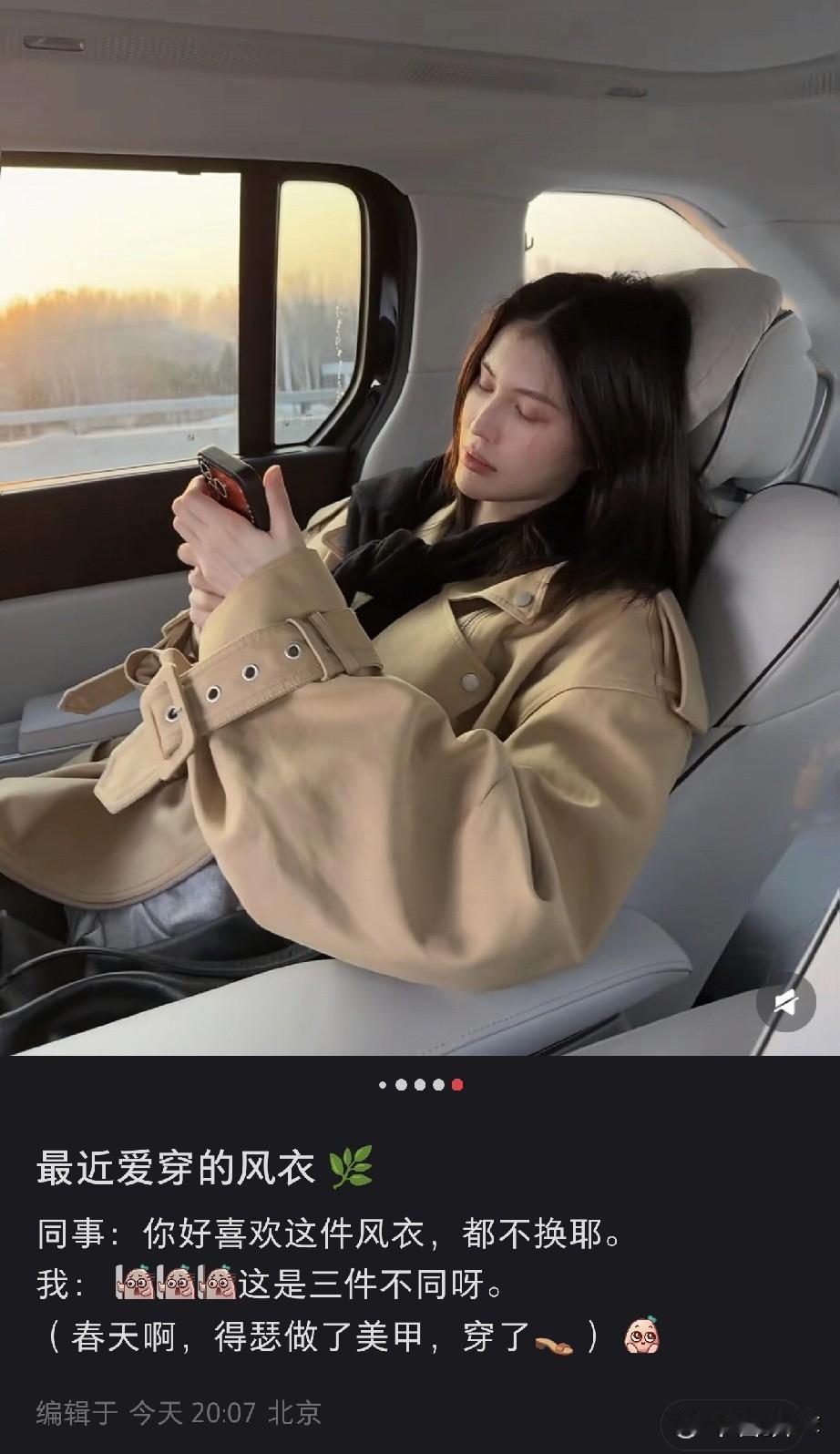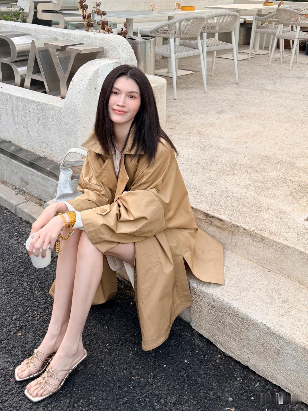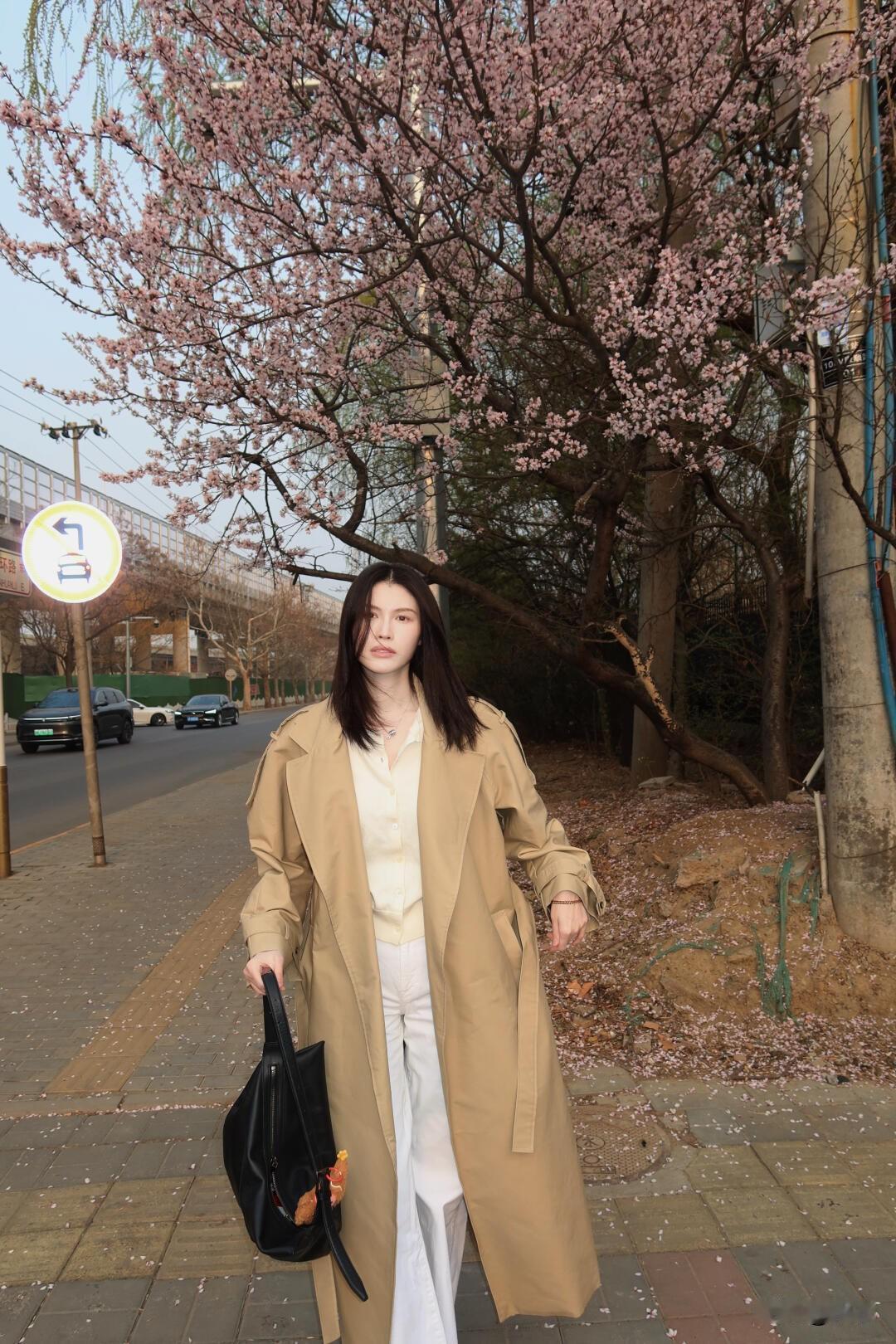 照片里的何穗看起来特别好看,她有178厘米那么高,什么样的衣服都能穿得很好看。不管是在车里懒懒地休息,还是在外面樱花树下散步,她都穿着这件卡其色的风衣,里面配着简单的衣服,有时候是温柔轻松的休闲样子,有时候又显得很清冷很有气质,换一换搭配就有了新感觉,难怪粉丝们会笑话她说“风衣像是长在身上了”。
