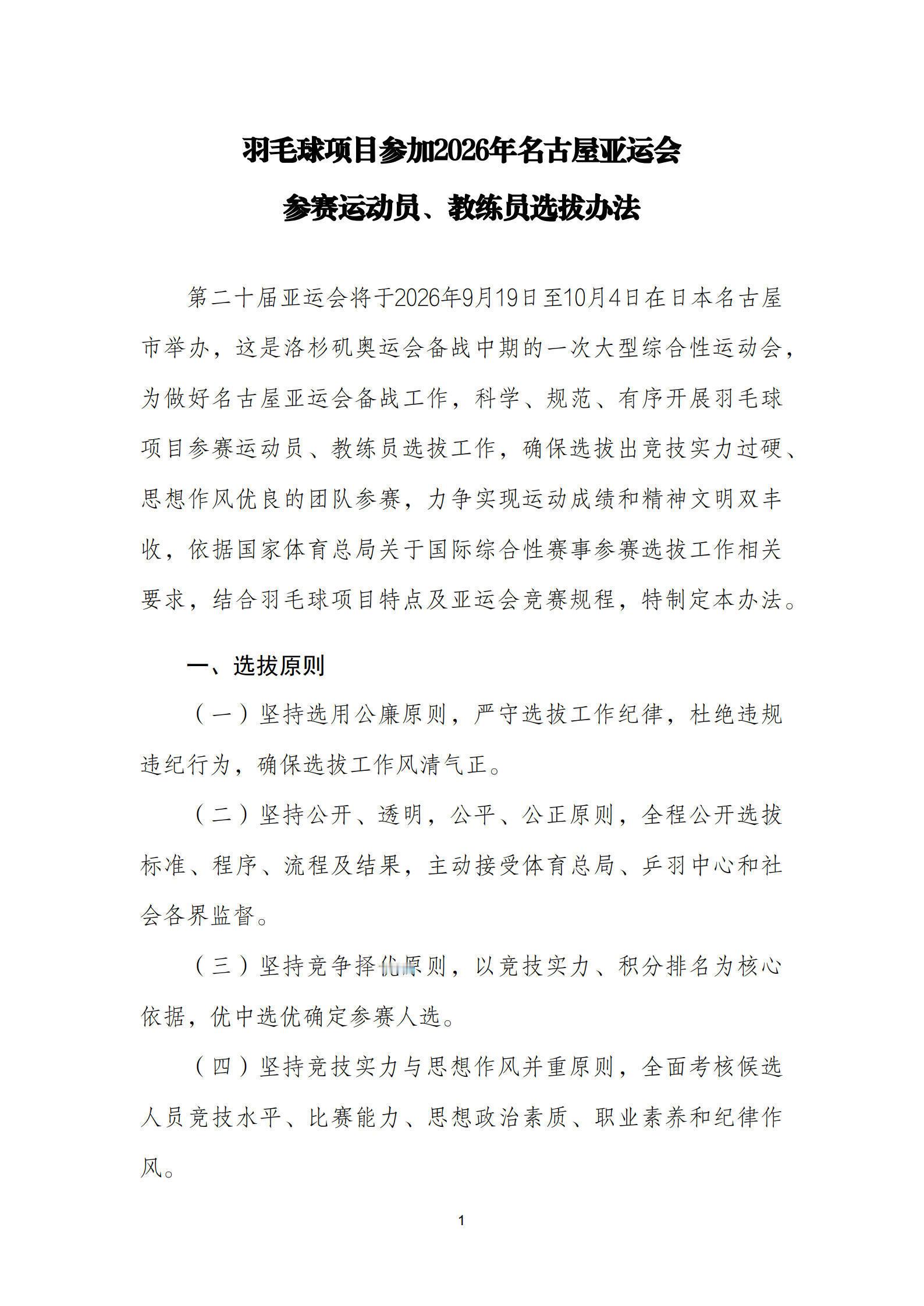 国羽爱知亚运会选拔办法公示以国际羽联世界排名积分为核心依据重点参考国际赛事成绩和外战水平