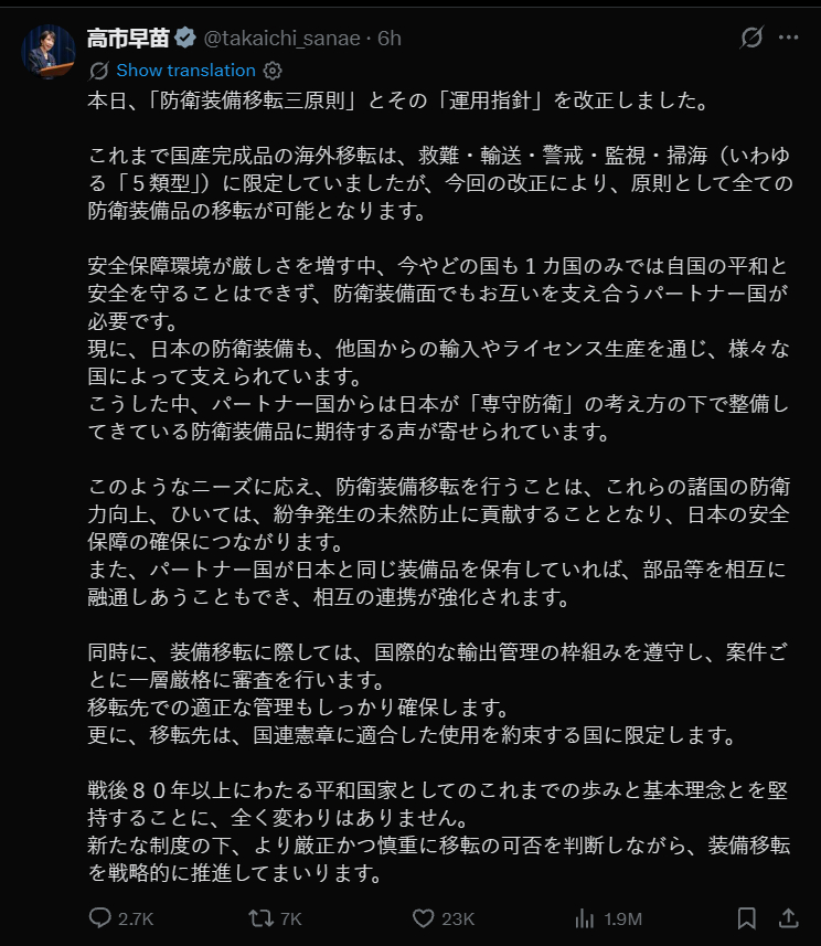 高市早苗的X今天贡献了一段非常适合当表情包的爆典上一条推特:我们突破了防衛装備移転三原則,马上就要出口制造精良的日本武器啦下一条推特:那啥大分县有个10坦克炸死了三男伤一女这事儿我知道了,马上调查清楚。😂