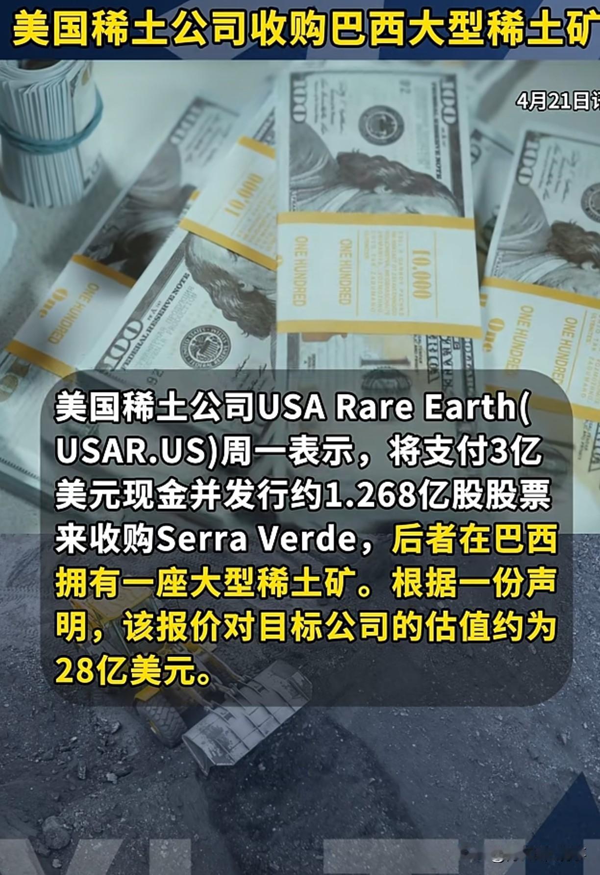 当地时间4月20号,美国稀土公司官宣,砸28亿美元全资收购巴西的塞拉维德集团,交易是3亿现金加1.268亿股新股,预计今年第三季度就能完成。