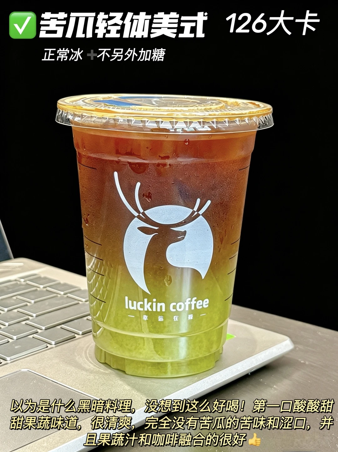 以为是什么黑暗料理,没想到这么好喝!第一口酸酸甜甜果蔬味道,很清爽,完全没有苦瓜的苦味和涩口,并且果蔬汁和咖啡融合的很好👍