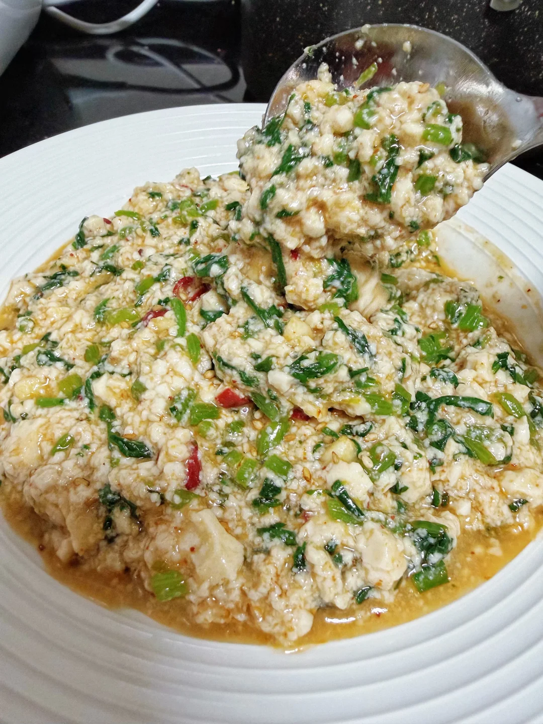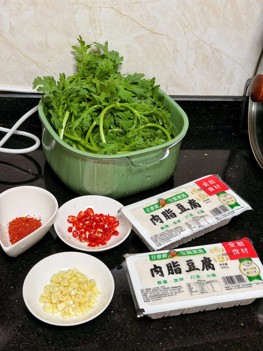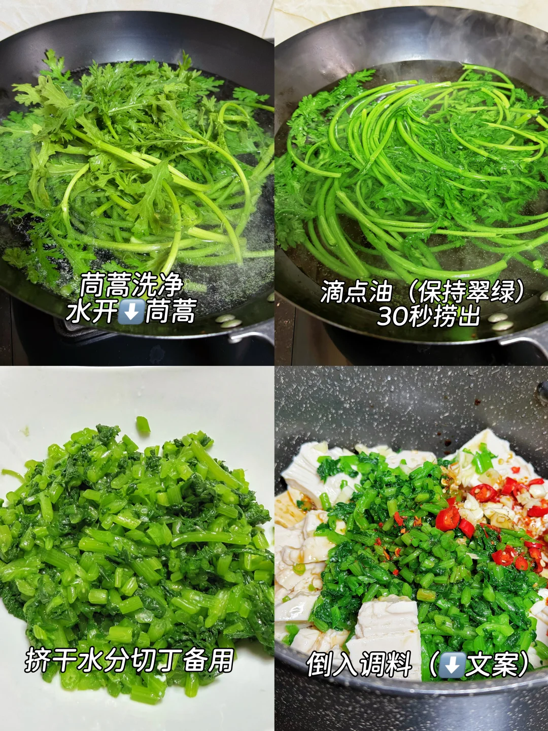 食材:茼蒿 豆腐 小米辣 蒜末 干辣椒(不吃辣可免)