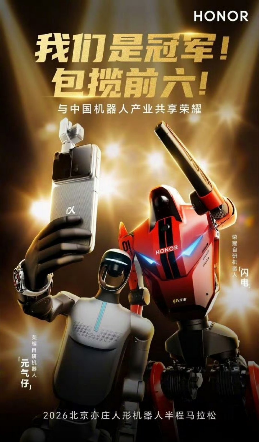 刷到亦庄机器人半马比赛的瞬间直接被震撼到了,在众多专门做机器人的大厂中第一次参赛的荣耀直接斩获冠军,机器人半马冠军出自做手机的荣耀真的太酷了!以前只知道荣耀手机青海湖刀片电池的能源技术续航强,东风散热引擎的热管理能力用在手机上也很有看点,这些技术直接用到了机器人身上也是完美解决了核心刚需,而且荣耀的阿尔法战略也很有远见,从手机到具身智能机器人,一步步拓展AI终端生态,用自己的核心技术稳步布局完整生态格局,真的会为荣耀骄傲,也期待未来能看到更多荣耀机器人的精彩表现!