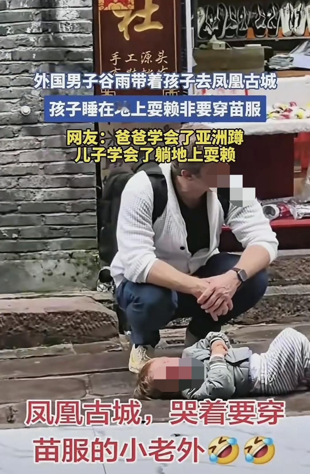 一名外国男子带着儿子去凤凰古城旅游,他儿子想要体验苗族服饰,他不太愿意。 他儿子