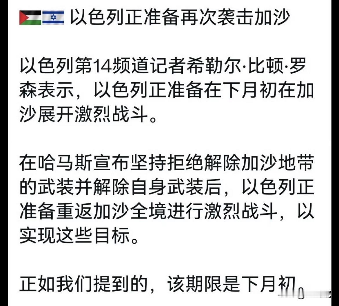 据以色列媒体消息,由于哈马斯武装拒绝解除武装,以色列国防军计划在下个月初恢复在加沙的军事行动,以实现解除该武装力量的目标。