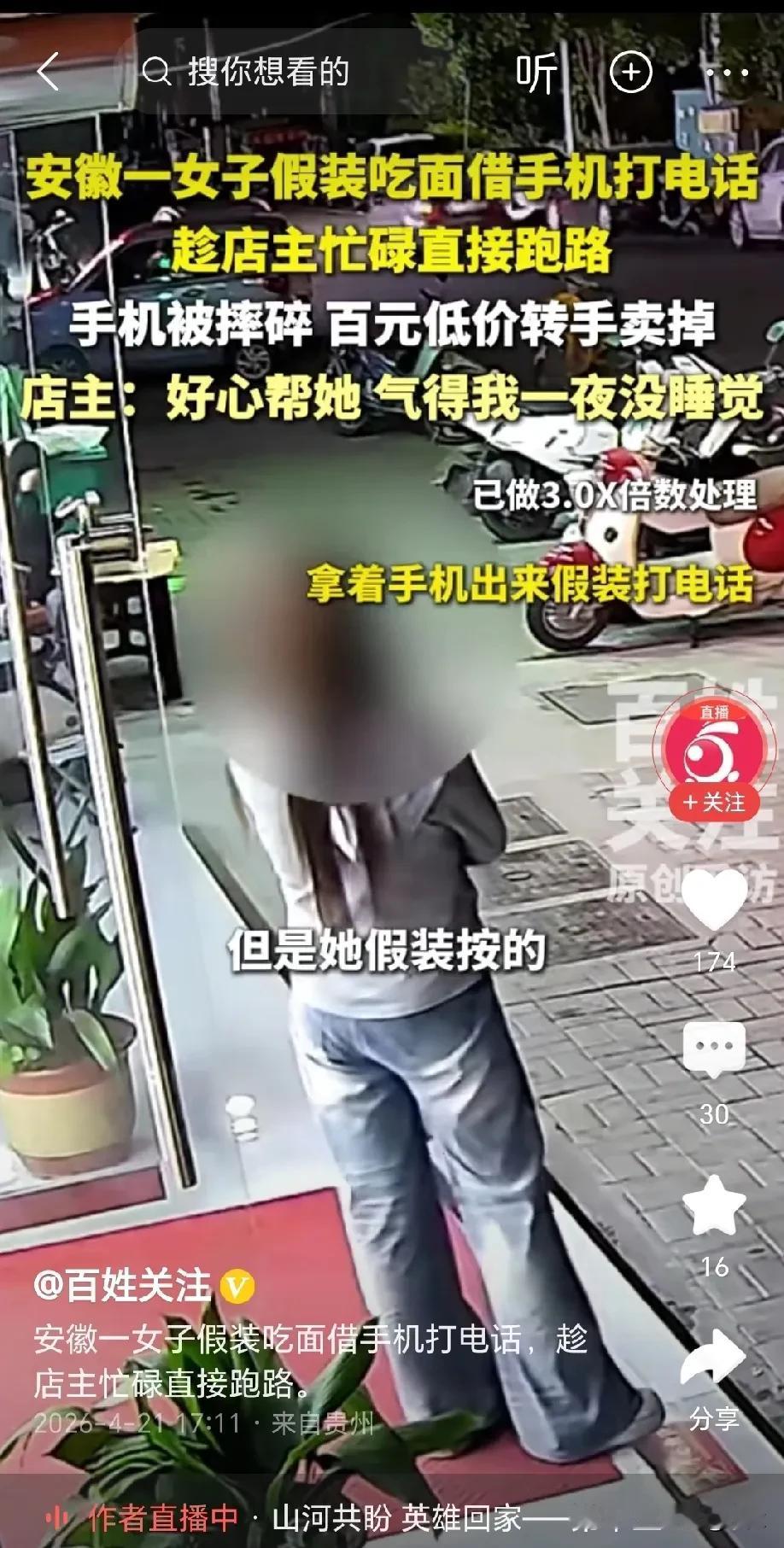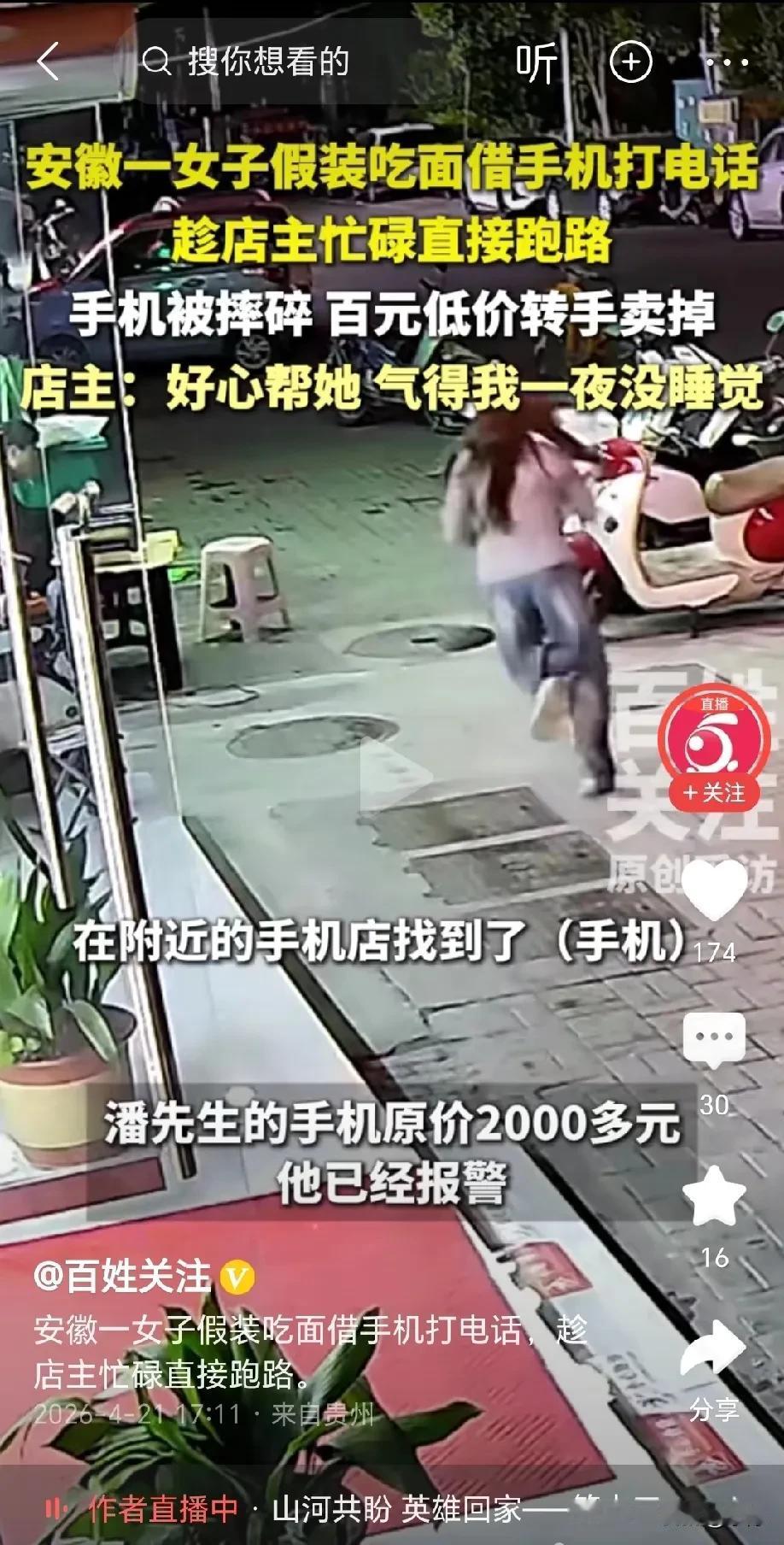 这招太损了!安徽,女子进面馆吃面,期间向老板借手机打电话,老板好心借手机给她,拿到手机后女子只是假装拨号,实则趁老板忙碌直接跑路,更恶劣的是,女子竟将手机摔坏,拿到手机店卖了一百块,得知真相后的老板更是气得一夜没睡,目前已经报警!