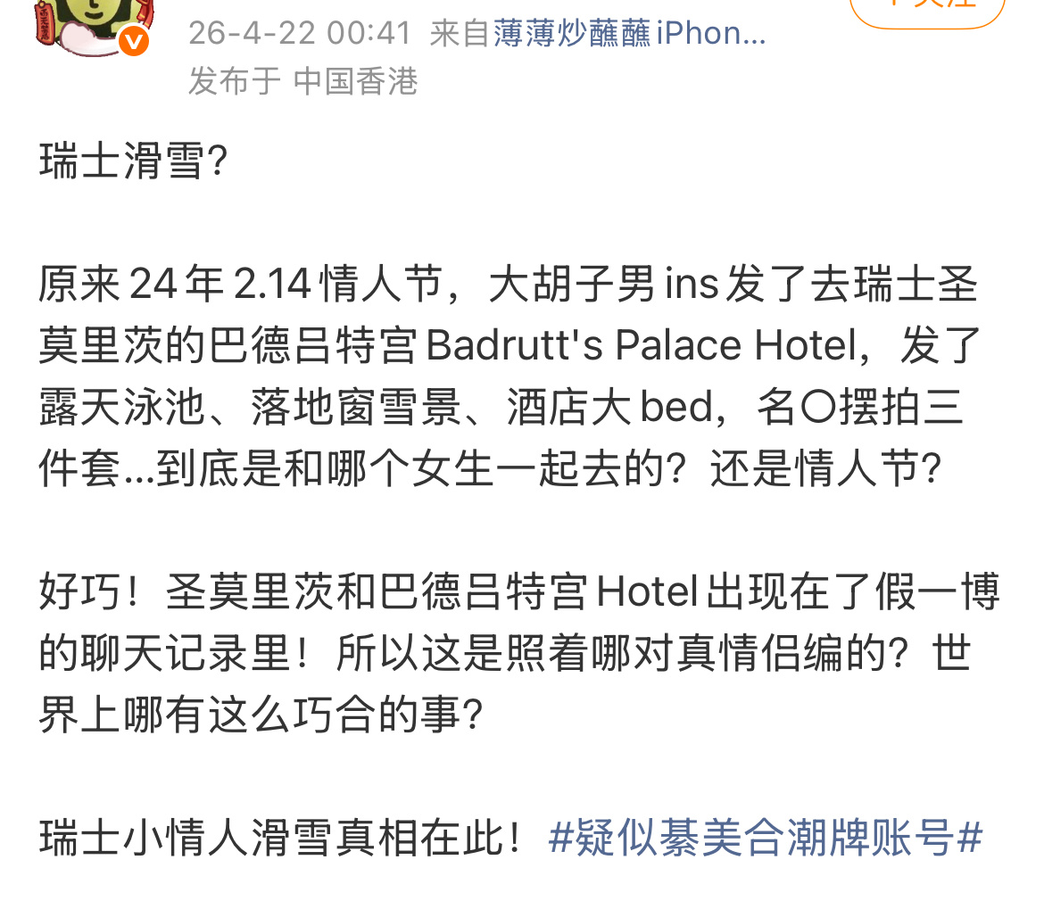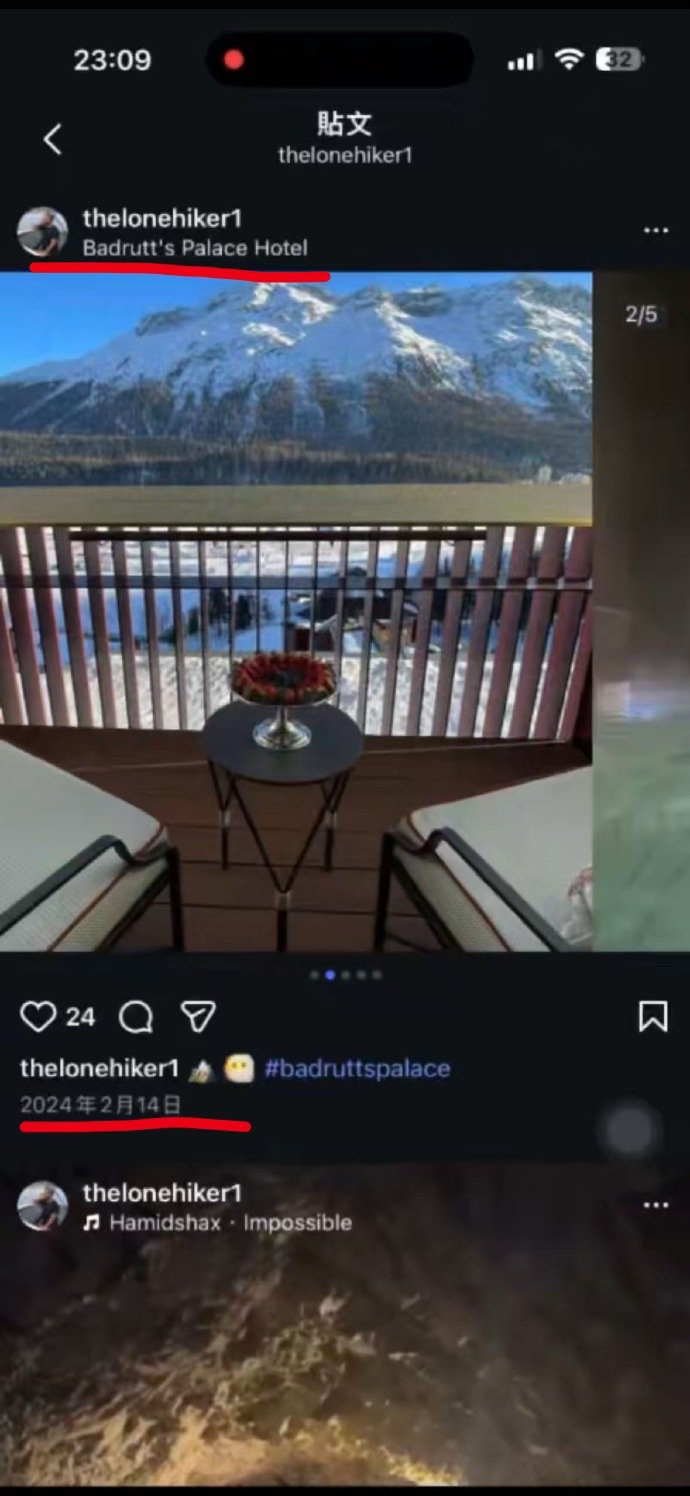 lsj聊天记录里提到的瑞士圣莫里茨的巴德吕特宫Badrutt's Palace Hotel,在美合白人老公的ins里找到了,那天还是情人节