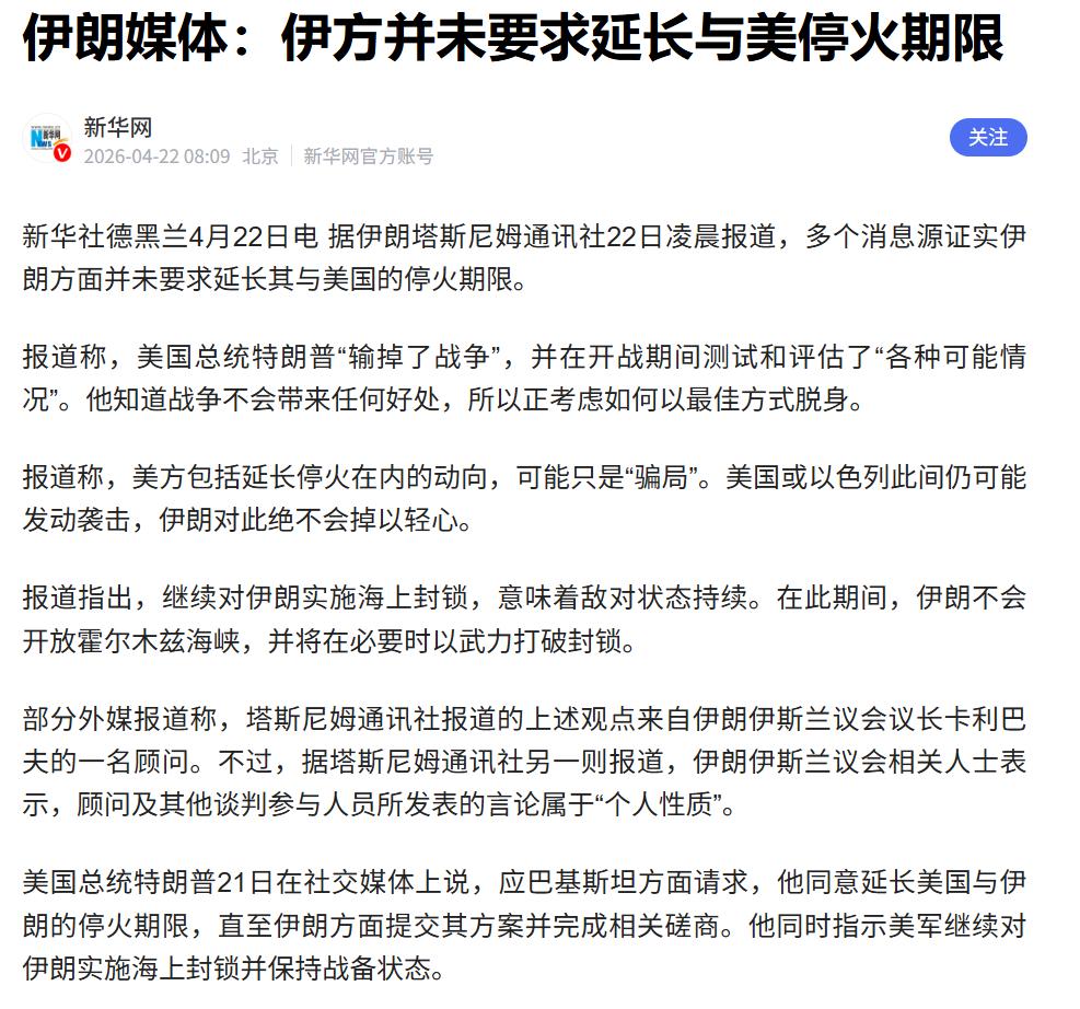 特朗普宣布决定后,伊朗官方至今没有做出正式回应。但与伊斯兰革命卫队关系紧密的塔斯尼姆通讯社对外放了一条消息,称伊朗从未要求过美方延长停火。