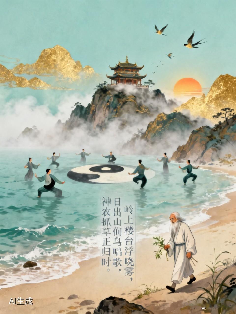 “岭上楼台浮晓雾,海边八仙戏太极。日出山间鸟唱歌,神农抓草正归时。”这几句诗勾勒出一幅如梦似幻的画面。让我想起金心明以“岭上”命名的画展,他笔下的山水超越现实,是对自然景色的独特表达。