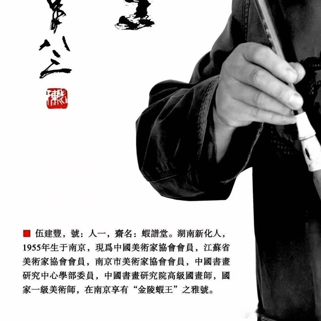 名家作品友情代理推荐分享【伍建丰】著名书画家,号:人一,斋名:虾谱堂。祖籍湖南新化, 生于南京,国家一级美术师,在南京享有“金陵虾 王”“水墨虾王”之雅号。师承国画大师陈大羽先生学习写意花鸟画,尤其特别痴迷于画虾,受到了著名书画大师陈大羽、武中奇、黄养辉先生“笔耕艺精”、“金陵奇 葩”、“笔下春风”的题跋。个人书画展期间,受到国内及国际艺术家高度评价,多次获金奖。有诗赞曰:虾有游龙誉,独缺宠鲤名。一生知己少,齐后“伍金陵”。与师友们分享,名家直供,三保:保真保友情价保按要求定制!(可垂询结缘)