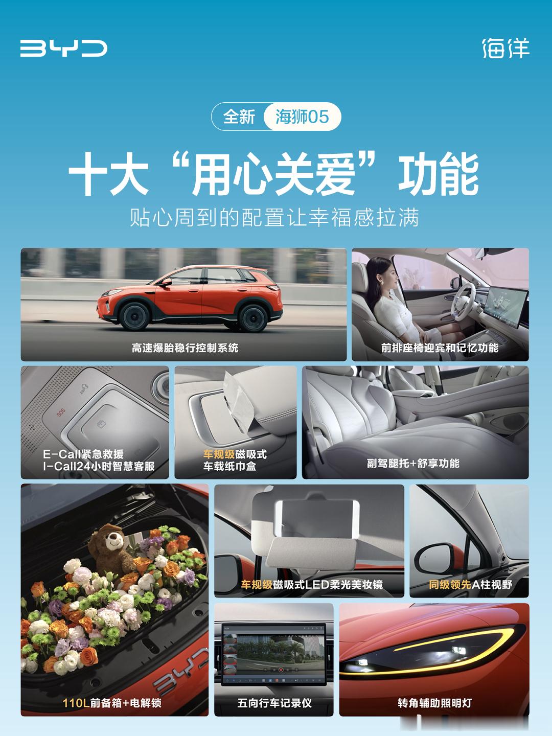 全新海狮05 核心亮点速览实力焕新进阶,配置越级登场轻松容纳出行所需,从容承载每一份期待舒适随心,每一程都自在发光 悦行越出彩出行不将就家用更讲究