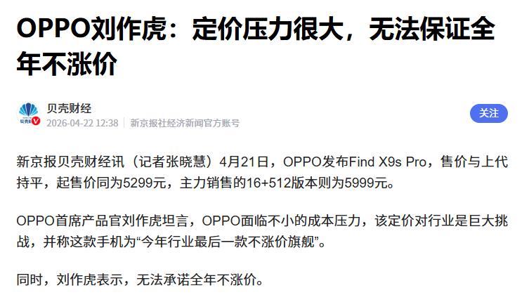 据了解,近期在OPPO发布新机后,其首席产品官刘作虎也就“内存短缺” “定价”等问题表示:OPPO面临不小的成本压力,该定价对行业是巨大挑战,所以无法承诺全年不涨价。