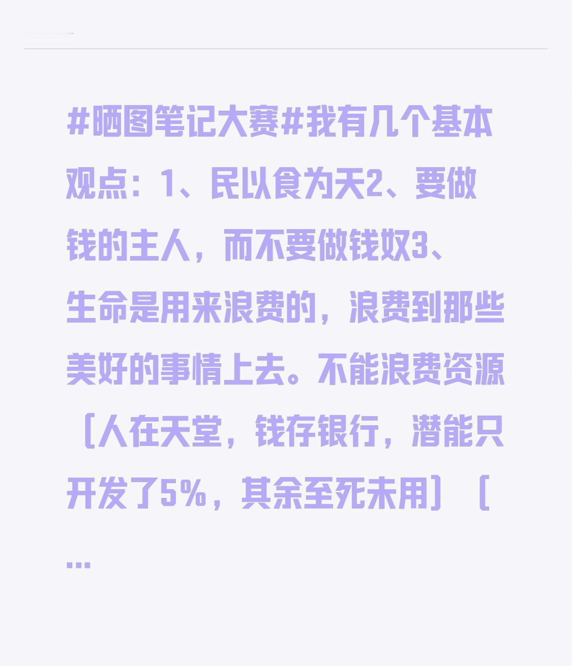我有几个基本观点: 1、民以食为天 2、要做钱的主人,而不要做钱奴 3、生命是用