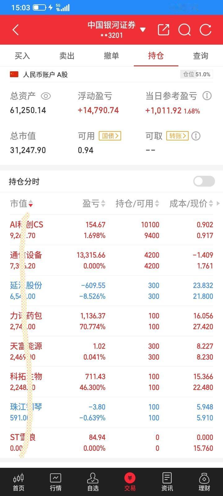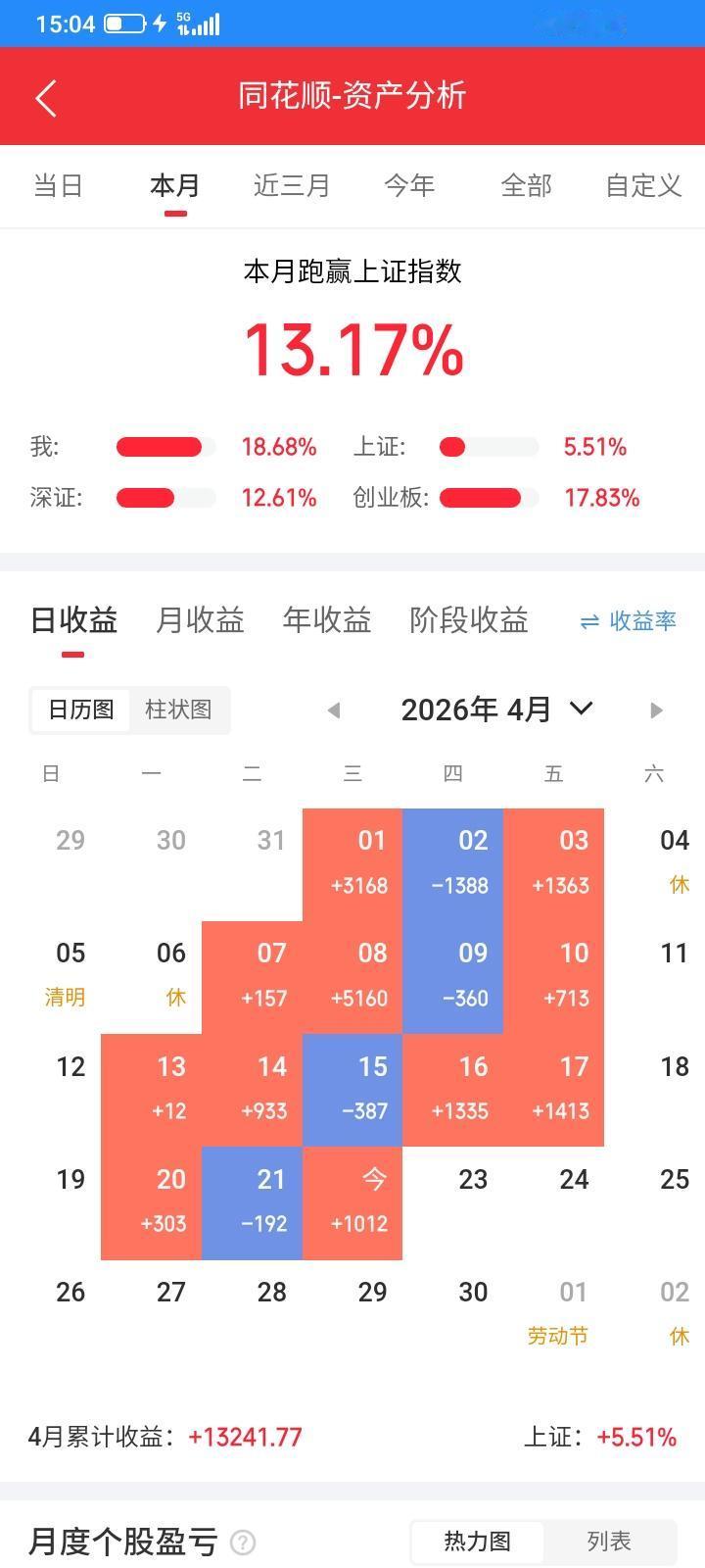 2026.04.22,今日股市持续上扬。手中持有的股票,3只下跌,3只上涨,2只etf再度大幅上涨,不过持仓量已所剩无几,错失了大涨行情,感觉损失颇大。