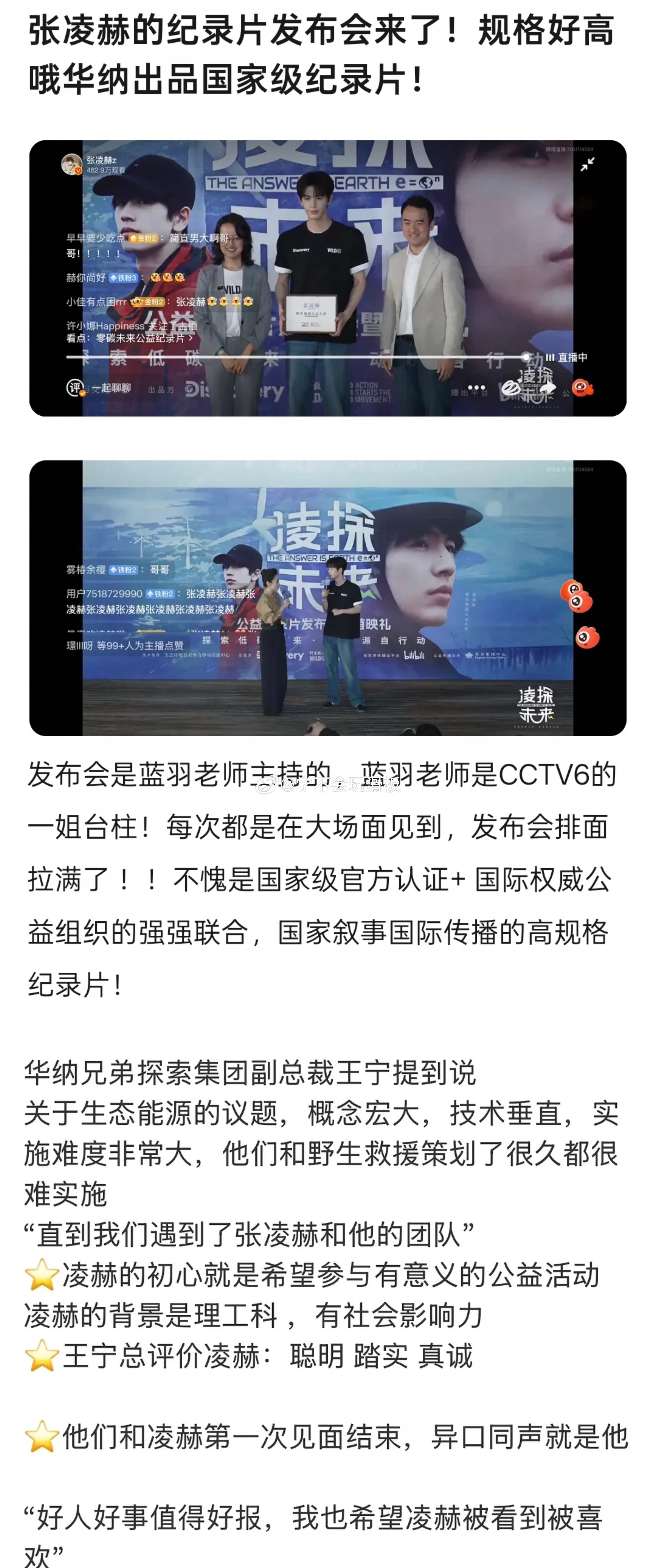 这个发布会规格挺大的,是华纳出品的国家级纪录片,是全球发行立项,包括主持人也是蓝羽老师,央视台柱子级别的主持人。