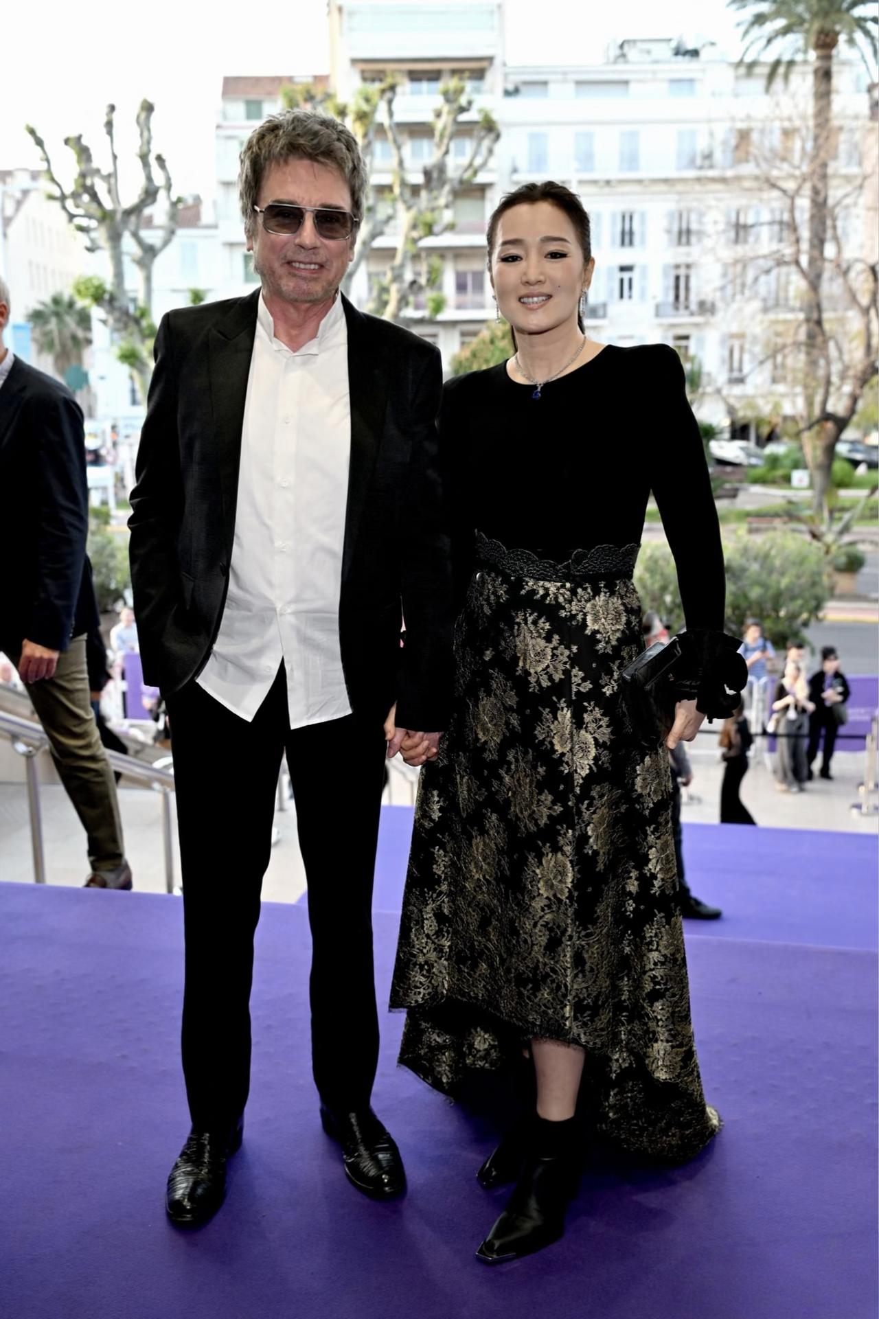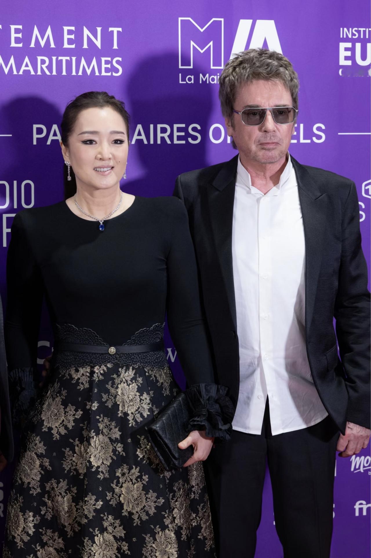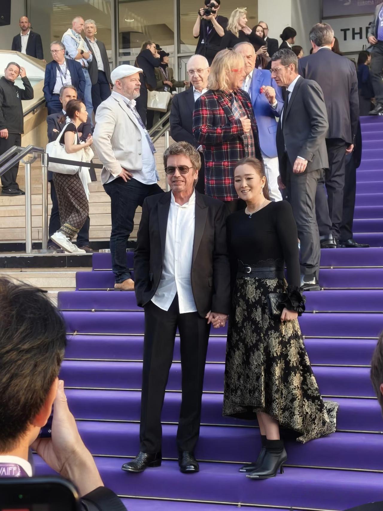 61岁巩俐和老公雅尔一起在法国参加电影节活动,夫妻俩牵着手到场,被好多记者围着拍