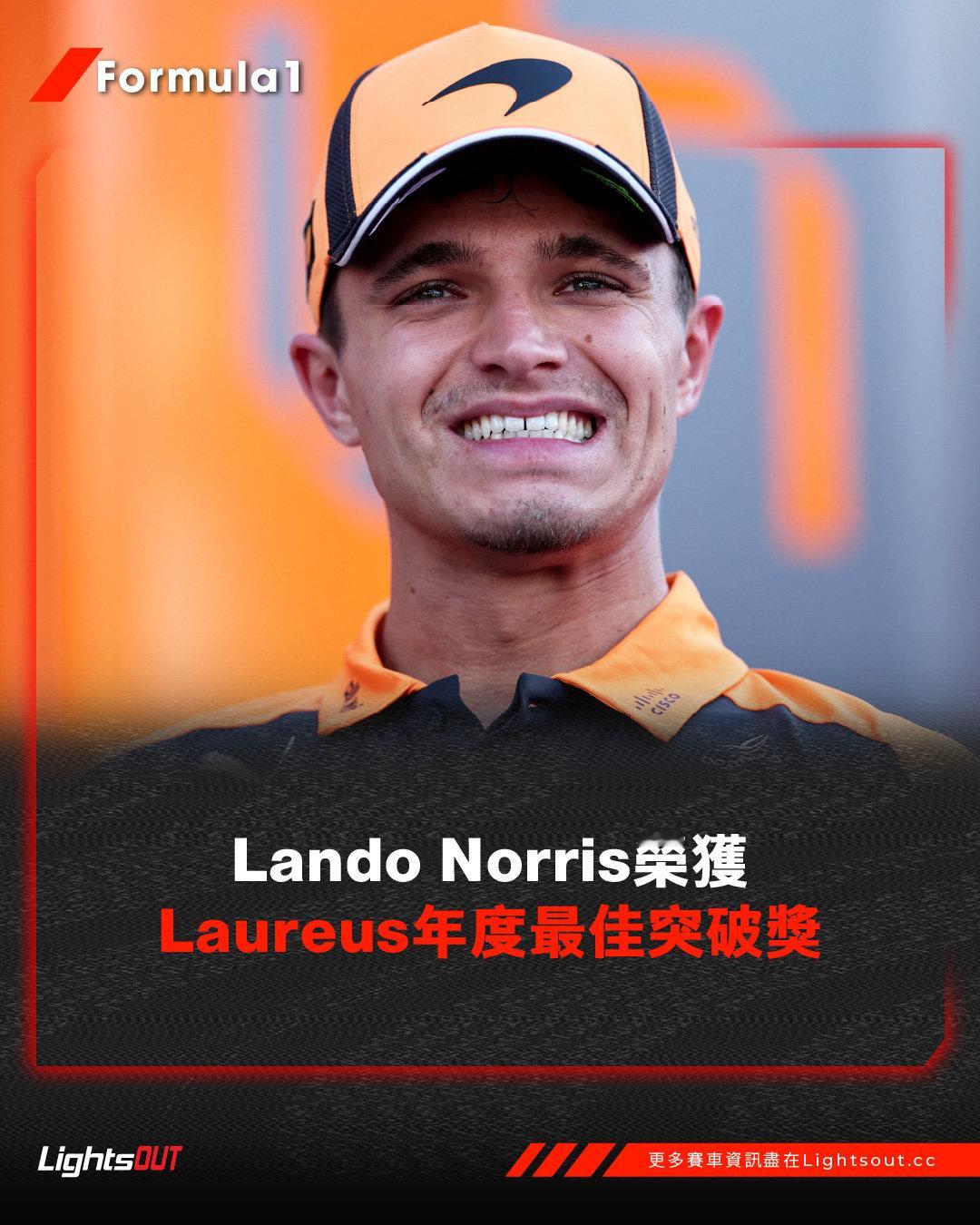 诺里斯获劳伦年度最佳突破奖! 卫冕车手世界冠军诺里斯在周一(22日)于马德里举行的劳伦斯世界体育颁奖典礼上获颁「年度最佳突破奖」。 去年上半季,诺里斯主要与队友皮亚斯特里内战,诺里斯 更曾失去积分榜领先位置,后来成功扭转劣势。诺里斯 的最大劲敌也从 皮亚斯特里 换成在下半季重拾竞争力,大幅收窄分差的维斯塔潘。3 人一直斗到最终战阿布扎比大奖赛,虽然 诺里斯 以分站季军完赛,但能够以两分之差赢得生涯首座世界冠军,中断维斯塔潘的统治。凭借这一佳绩,诺里斯 获提名劳伦斯「年度最佳突破奖」,更击败包括英国飞镖运动员 Luke Littler、法国足球员 Désiré Doué、巴西网球手 João Fonseca、加拿大篮球员 Shai Gilgeous-Alexander 以及中国游泳选手于子迪拿下奖项。同时诺里斯所属的 迈凯伦车队亦获得提名竞逐「年度最佳团队奖」,但最终由著名足球队巴黎圣日耳曼荣膺此奖项。