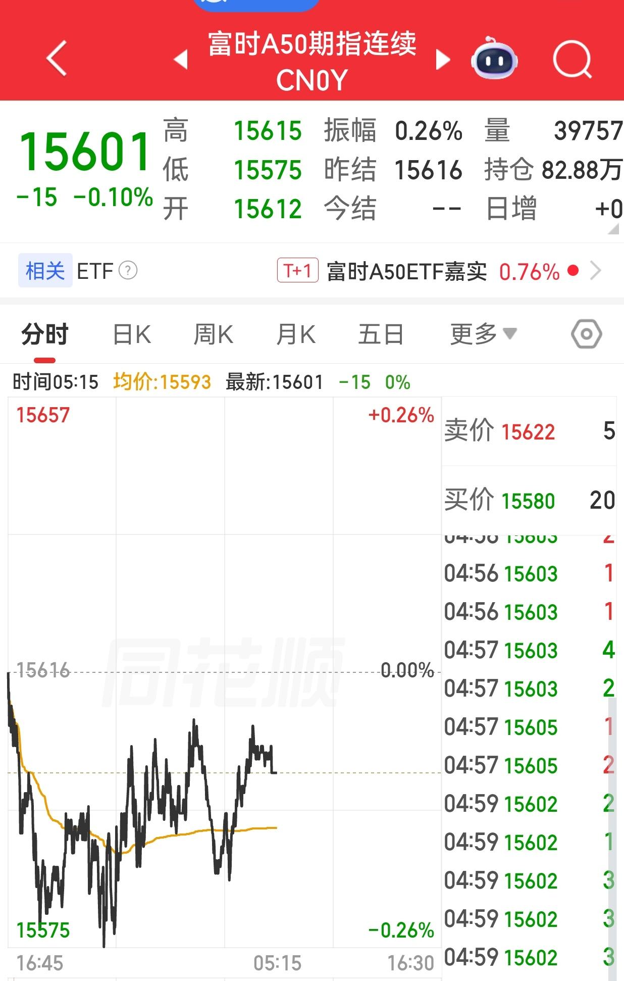 富时A50期指连续夜盘收跌0.10%,报15601点。