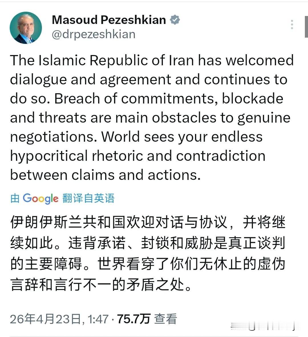当地时间4月23日,伊朗总统佩泽希齐扬发文写道:“伊朗伊斯兰共和国欢迎对话与协议,并将继续如此。违背承诺,封锁和威胁是真正谈判的主要障碍。世界看穿了你们无休止的虚伪言辞和言行不一的矛盾之处。”