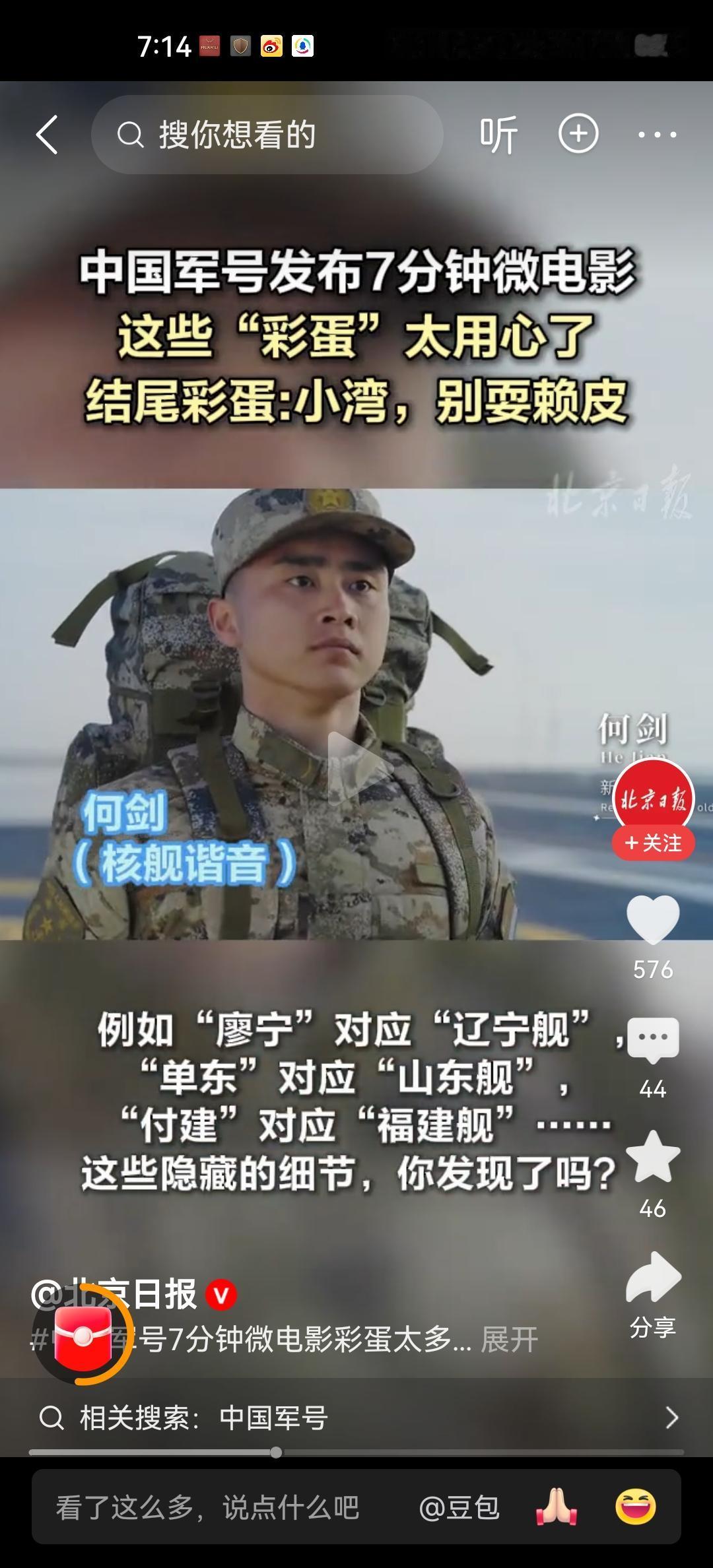 在视频中,海军接续传承的老兵,都有着意味深长的名字,对应着我们的航母。第一个叫做廖宁,对应了我国第1艘航母辽宁舰:第2个叫做单东,那就是大名鼎鼎的山东舰;第3个叫做付建,就是我们的第3艘航母福建舰。最后出来了一个老兵,他的名字叫何剑,它对应了什么呢?