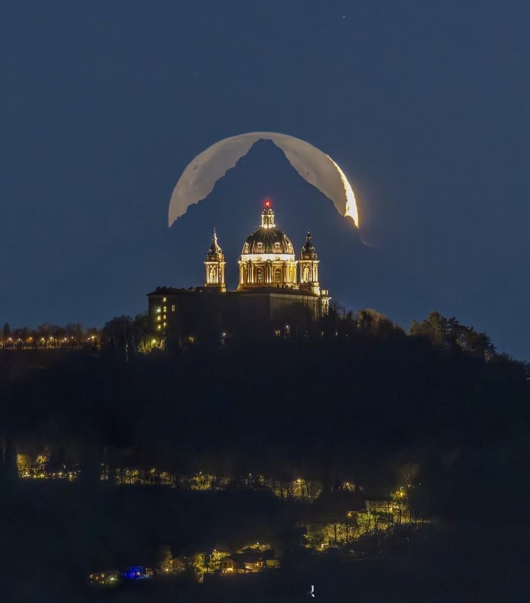 摄影师Valerio Minato等了6年才拍到这张照片!月亮被山峰和大教堂的圆顶完美地环绕着。