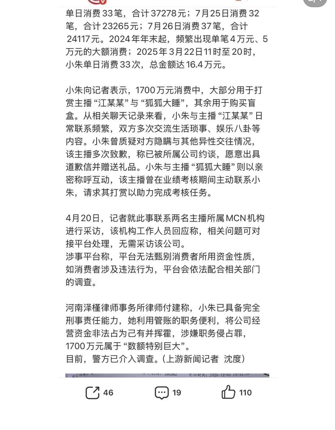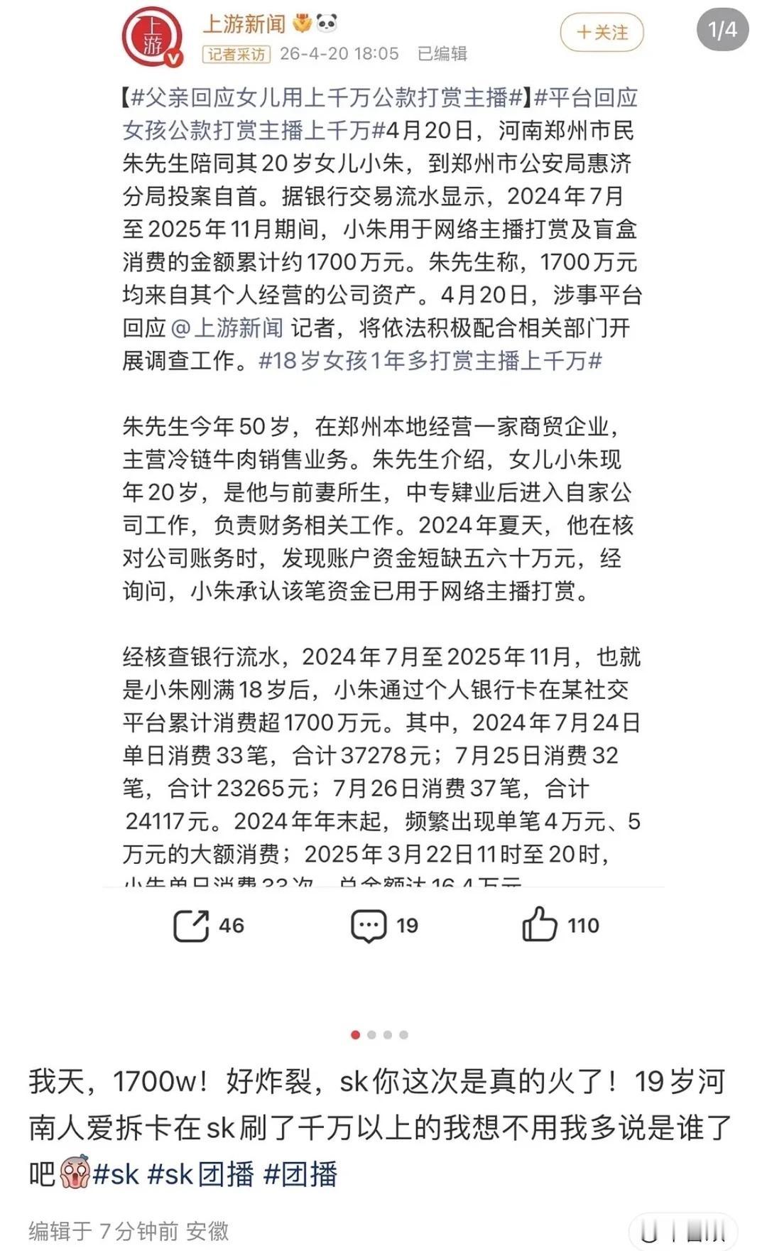 19岁女孩挪用1700万打赏各种主播的事,怪吓人的,